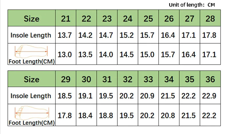 Перед заказом, пожалуйста, Измерьте длину стопы вашего ребенка и выберите правильный размер.1. Пожалуйста, не измеряйте длину стельки, это не длина стопы.2. При измерении длины стопы, пожалуйста, добавьте длину около 0,5 см. Ребенок быстро растет, и мы бы лучше выбрали обувь немного большего размера.3. Выберите правильный размер в соответствии с нашей таблицей размеров.Размер соответствует длине стопы:SIZE21: 13 см, SIZE22: 13,5 см, SIZE23: 14 см, SIZE24: 14,5 см, SIZE25: 15 см, SIZE26: 15,7 см, Size27: 16,4 см, SIZE28: 17,1 см, SIZE29: 17,8 см, SIZE30: 18,4 см, SIZE31: 18,8 см, SIZE32: 19,5 см, SIZE33: 20,2 см, SIZE34: 20,8 см, SIZE35: 21,5 см, SIZE36: 22,2 см