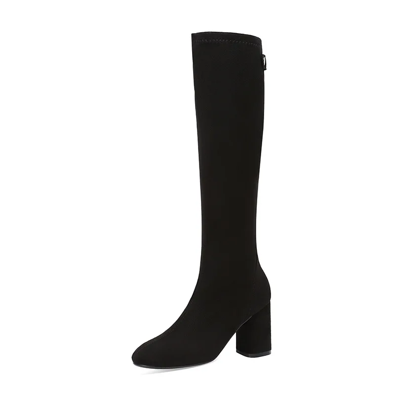 Новинка 2021, модные повседневные эластичные бархатные облегающие высокие сапоги до колена на высоком квадратном каблуке, обувь для женщин
