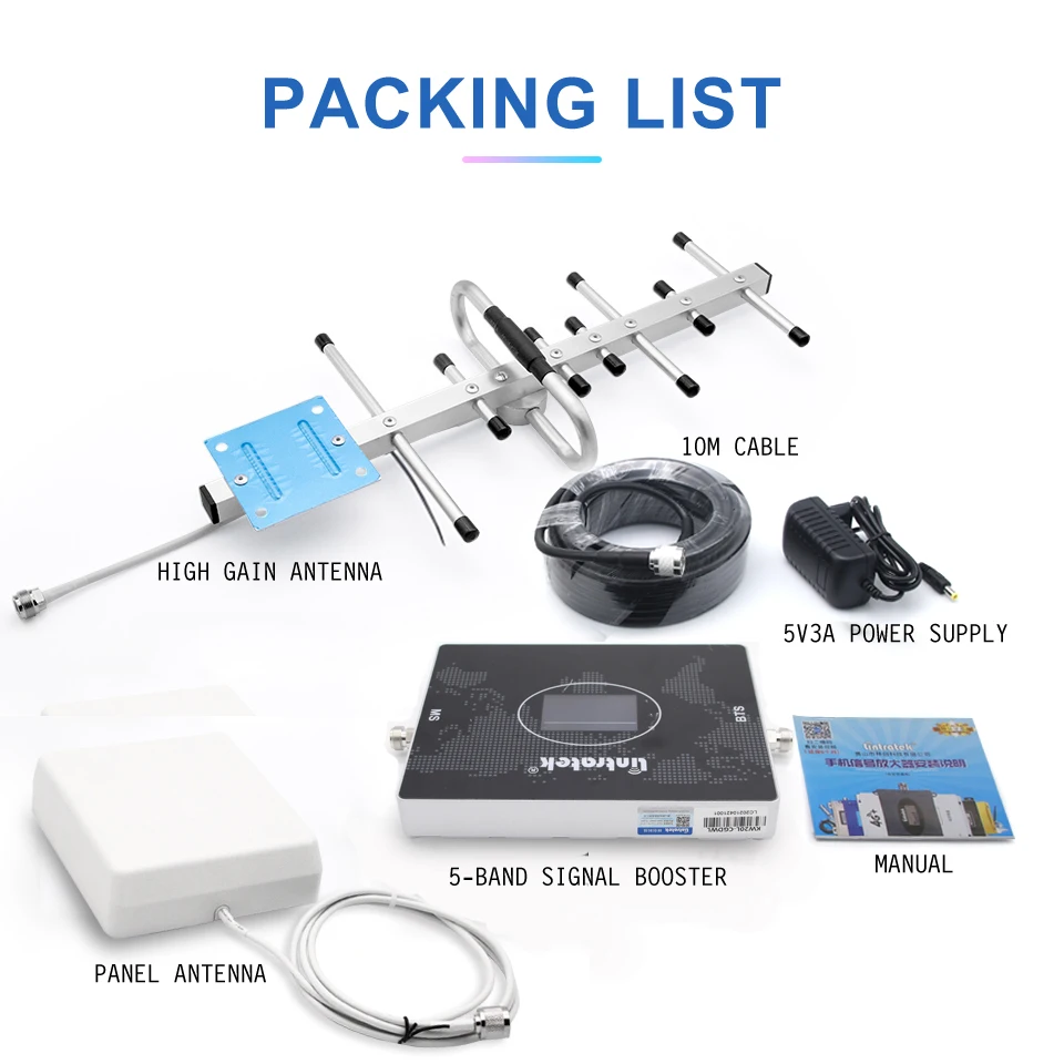 5-полосный усилитель сигнала 800 900 2100 1800 2600 МГц * 1Наружная антенна 12 дБи * 19 дБи комнатная антенна * 110-метровый кабель * 1Источник питания * 1