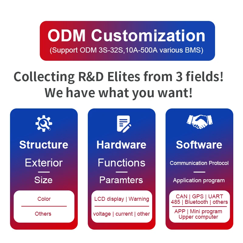 Важная особенность ◆ UART: UART является универсальным асинхронным приемником/передатчиком, он преобразует данные, которые будут передаваться между последовательной связью и параллельной коммуникацией. Как чип для преобразования параллельных входных сигналов в серийные Выходные сигналы, UART обычно интегрируется в другие коммуникационные интерфейсы. ◆ RS485: Пожалуйста, выберите модель RS485. RS-485 принимает сбалансированную передачу и дифференциальный прием, поэтому он имеет способность подавлять помехи в обычном режиме. ◆ Модуль Bluetooth: если вам нужна эта функция, пожалуйста, выберите модуль bluetooth, если вы не покупаете его, мы не отправим его вам. ◆ Вы должны купить аксессуары ниже отдельно: кабель 1,usb к UART 2,usb к кабелю RS485 3. Модуль Bluetooth 4. Индикатор питания 5. ЖК-экран управления BMS