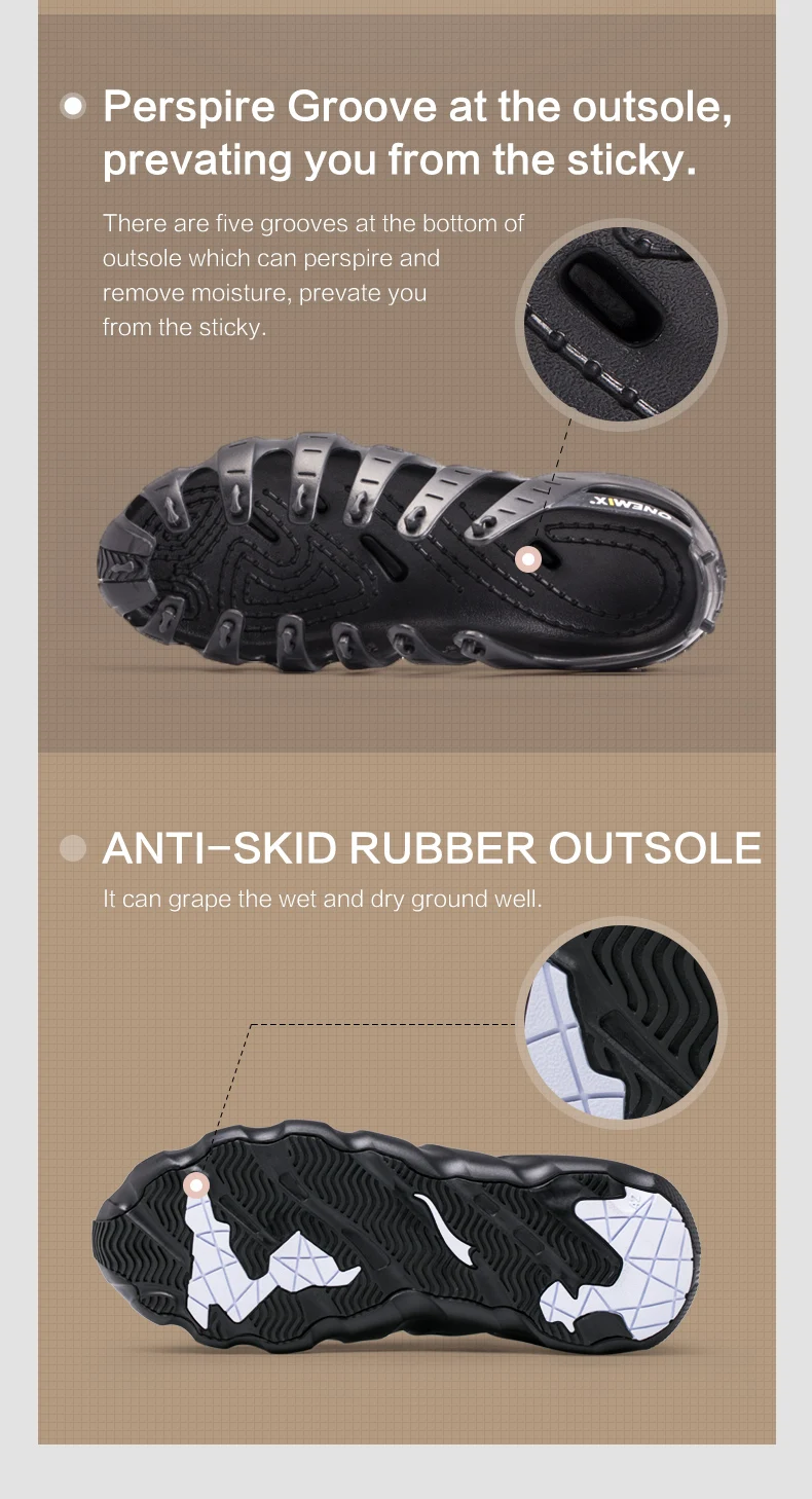 4. Перспиральная паза на подошве, предотвращающая вас от липкости. В нижней части подошвы есть пять канавок, которые могут впитывать и отводить влагу, предотвращая появление липкости. 5. Нескользящая резиновая подошва Он может хорошо очищать влажную и сухую землю