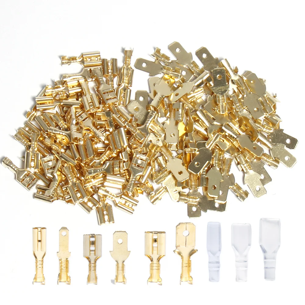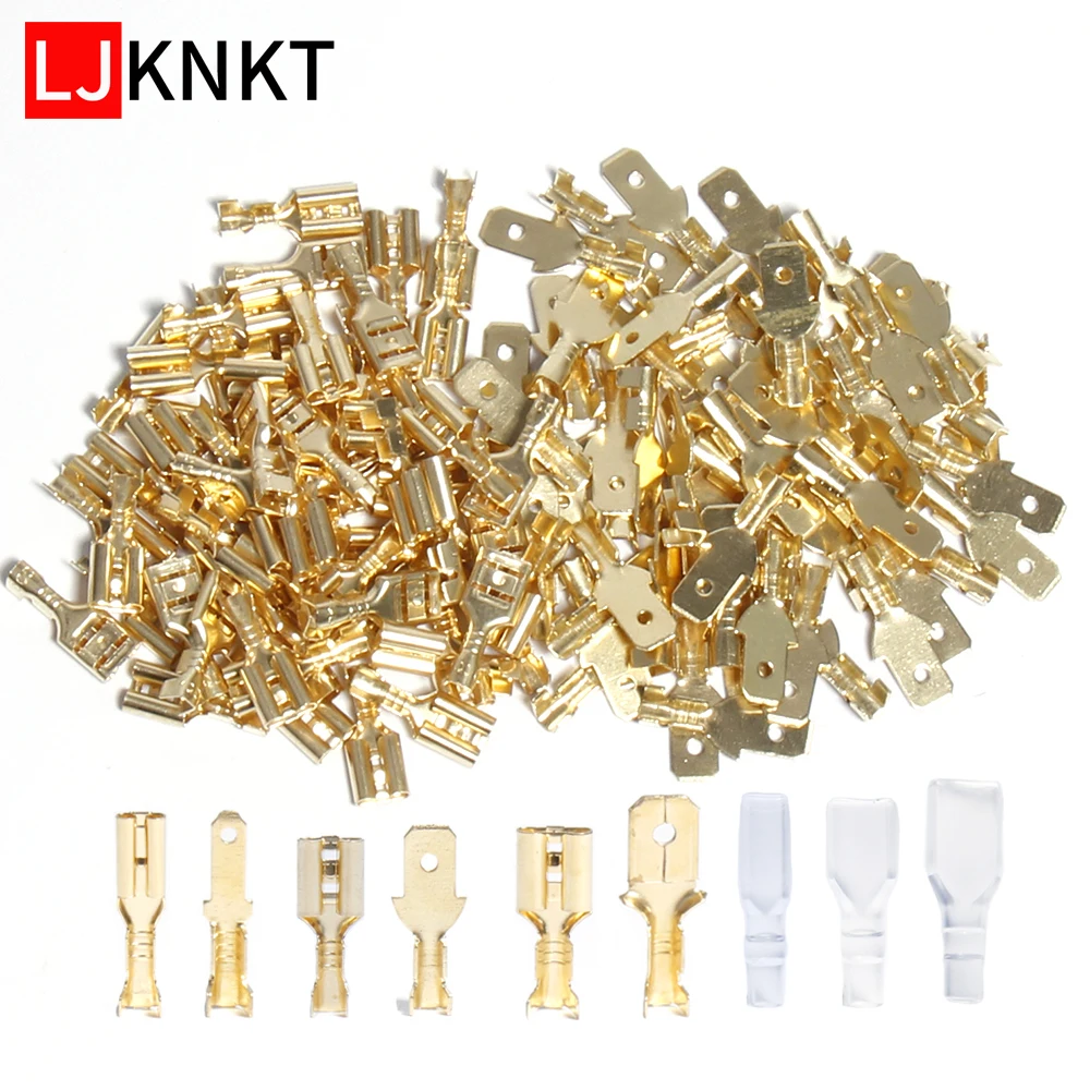 Обжимной клеммный соединитель, Золотая латунь, 2002,84,8 мм, штекер-гнездо для автомобильной акустики, Электрический лопаточный штекер, набор разъемов для проводов, оболочка, 6,3 шт.