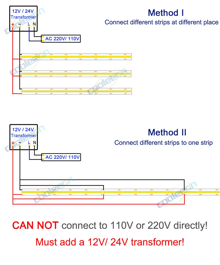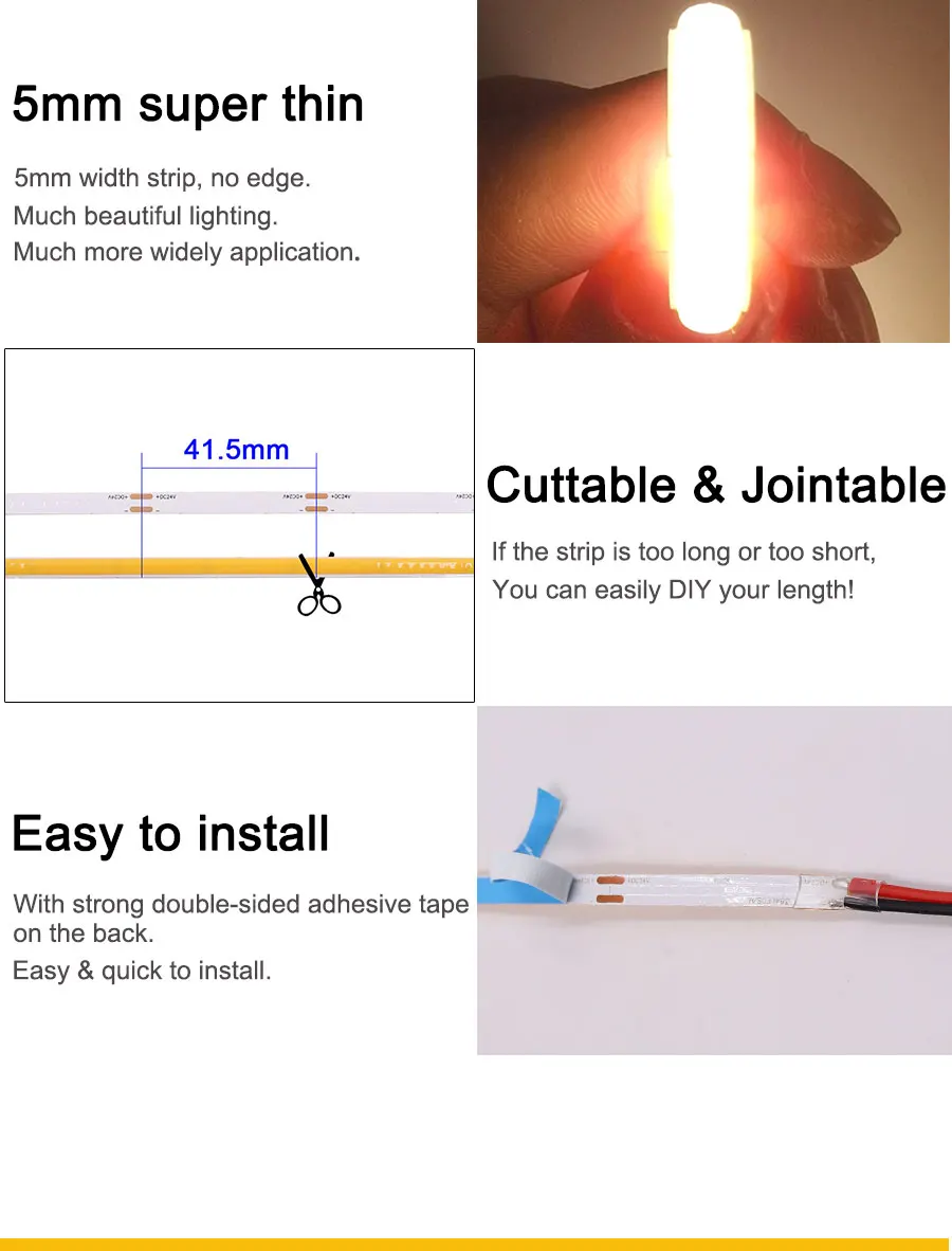 1. Полоса не может подключаться к 220 В или 110 В напрямую! Он нуждается в 12V/24V трансформатор!2. Прокладка COB соединена 50 см-полоской, поэтому на полосе есть несколько стыкованных (сварочных) точек, это очень нормально!