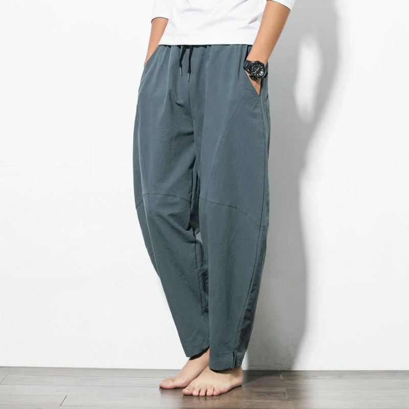 Брюки мужские однотонные из хлопка и льна, повседневные штаны свободного покроя, брюки-султанки с широкими штанинами и завязкой, большие размеры, лето 2021