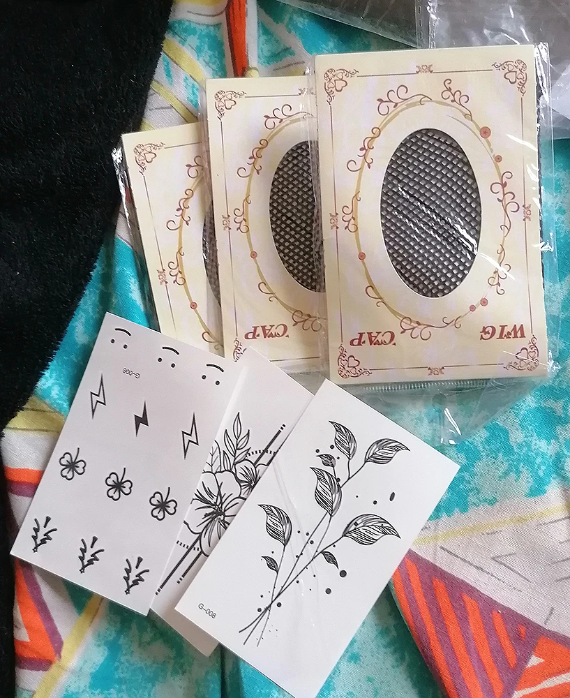 Все парики пришли быстро. Положили к ним сеточку и небольшой подарок - временные тату. Местами выглядит неплохо, однако верх слишком пышный и густой - совсем не как на фото. К сожалению из-за этого волосы идут не так, как ожидалось и спереди выглядит как прическа из 80-ых.