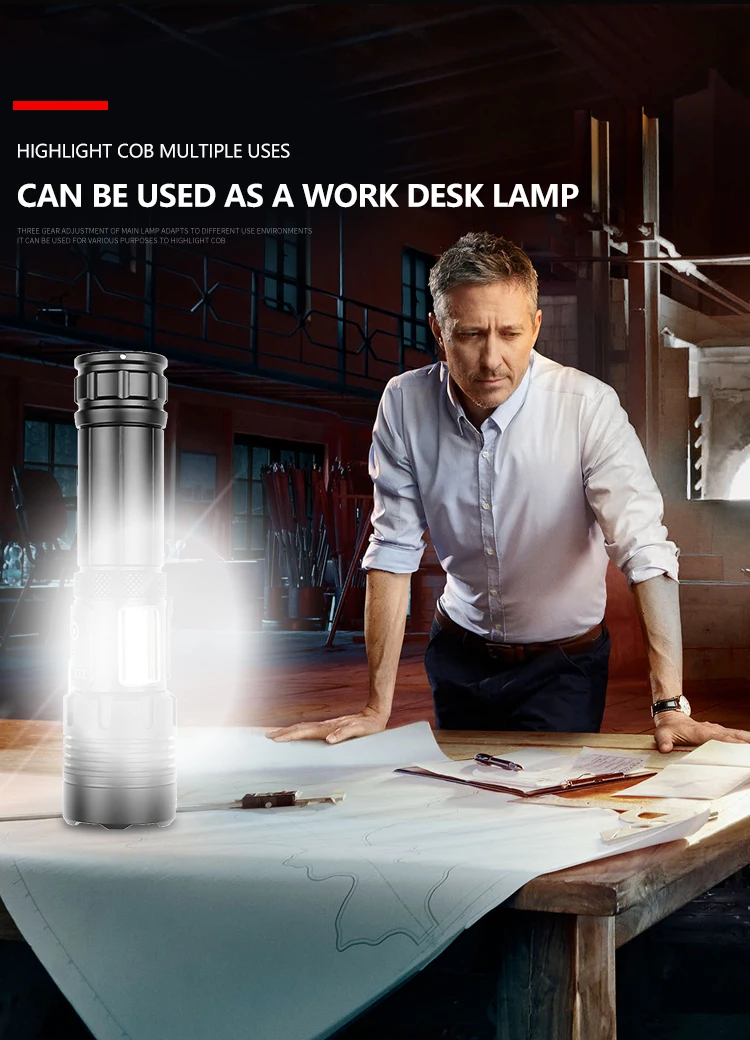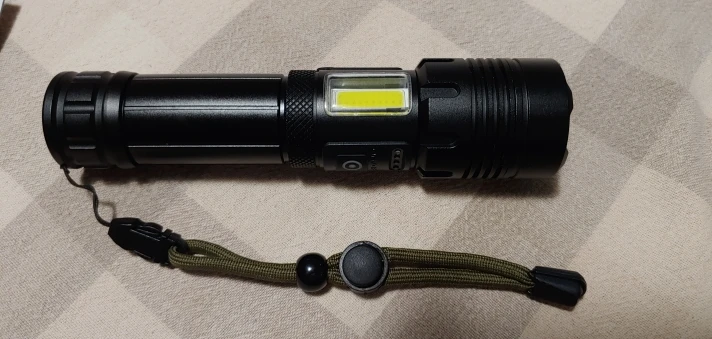 Я быстро получил этот заказ менее чем за месяц из Китая в Болгарию. Фонарик был хорошо упакован, никаких повреждений от транспортировки. Внутри коробки есть подарок-лампа USB. Фонарик выглядит так, как будто он описан в рекламе продавца. Мастерство кажется достойным и светоизлучающая мощность не плохая. Основной светодиод имеет три режима-сильный, слабый и мигающий. Боковая COB лампа не такая bringt, но ее достаточно для ночного освещения. Он имеет две интенсивности и красный режим.