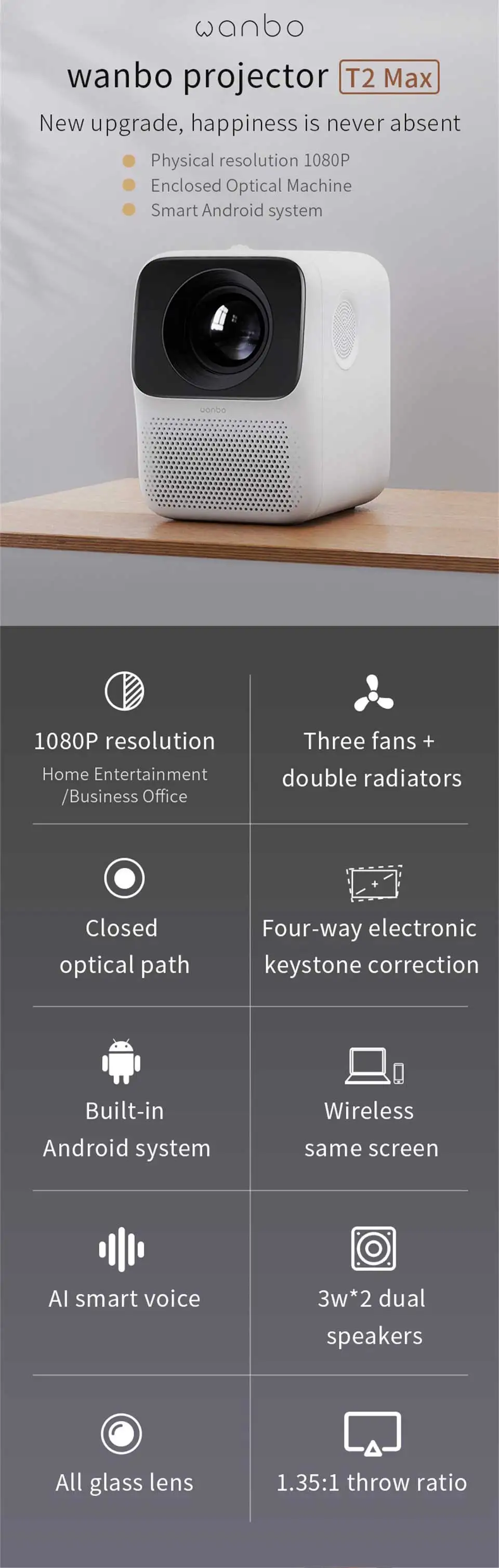 Светодиодный мини-проектор Wanbo T2 MAX, Full HD, 1920*1080P, поддержка 4K, видеопроектор, умный проектор с Wi-Fi для домашнего кинотеатра