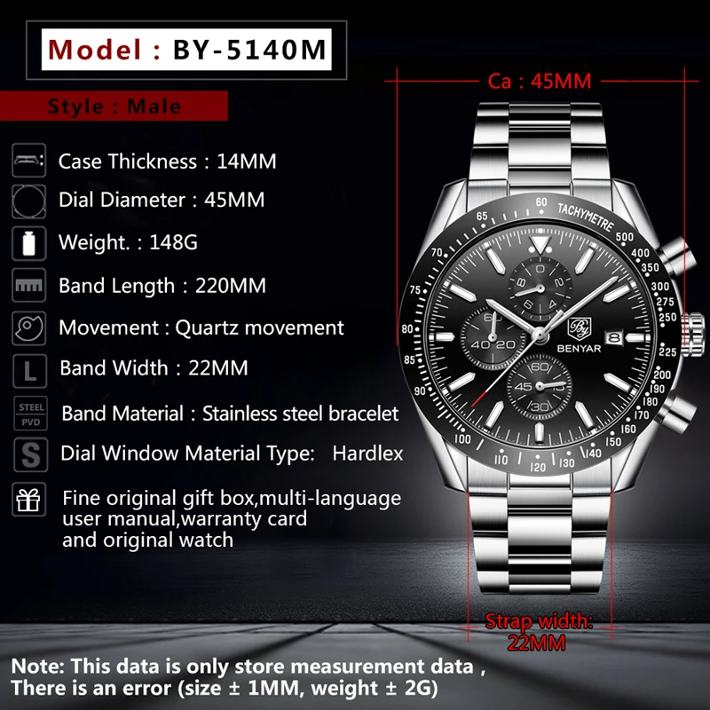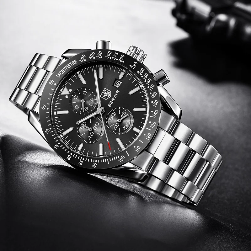 Часы BENYAR 2021 Мужские кварцевые, брендовые Роскошные деловые стальные повседневные водонепроницаемые до 30 м