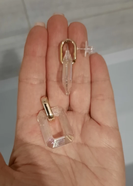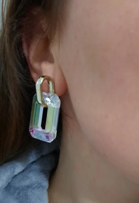 Простые бюджетные серьги, в целом так и выглядят. Самые дешевые замочки из пластика, из-за чего серьга перевешивает.