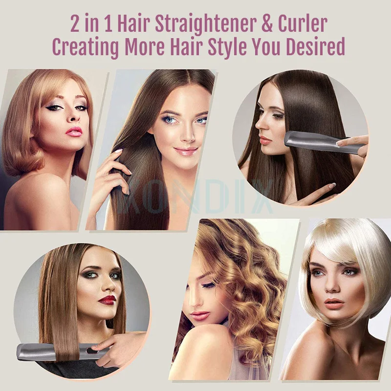 Защита волос от ионов воды, постоянная защита от температуры, не впитывает влагу, не повреждает. 2 в 1 Многофункциональный Железный Плоский Выпрямитель для волос, который может выпрямить и завить волосы. Безопасен в использовании, натуральный и не токсичен. Индивидуальный дизайн, светодиодный терморегулятор. Прост в использовании. PTC нагреватель с быстрым нагревом и ультра быстрым восстановлением тепла.