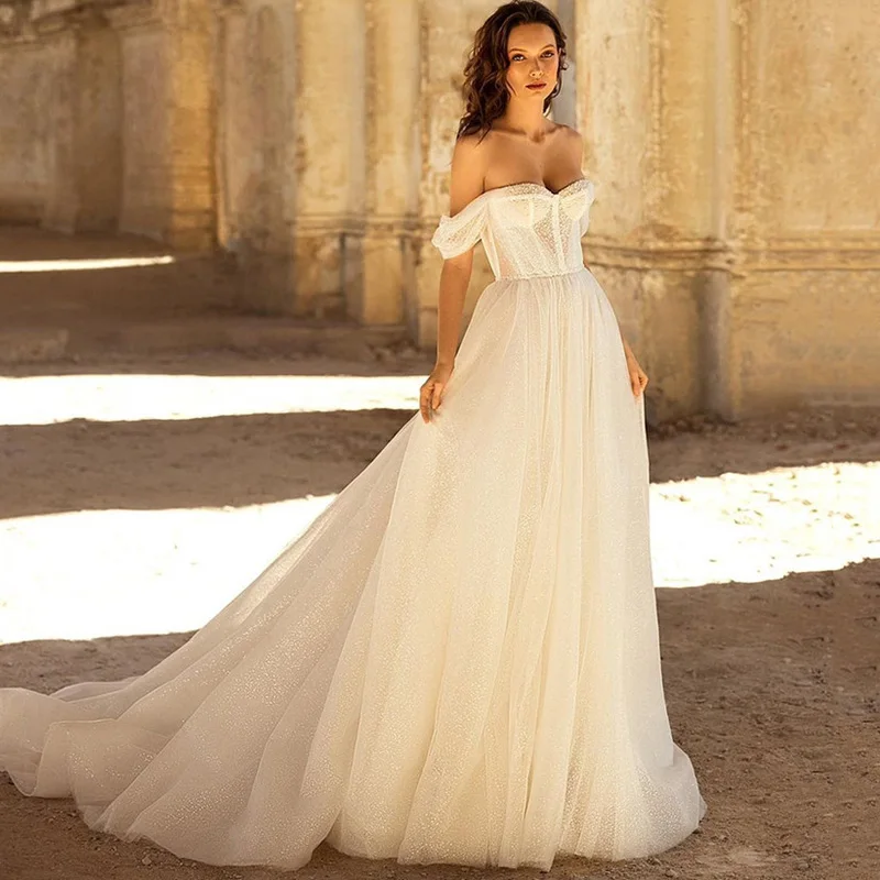 Блестящее свадебное платье, бежевое ТРАПЕЦИЕВИДНОЕ ПЛАТЬЕ с открытыми плечами, Пляжное свадебное платье, тюлевый корсет с блестками на спине, винтажные сексуальные свадебные платья, 2021