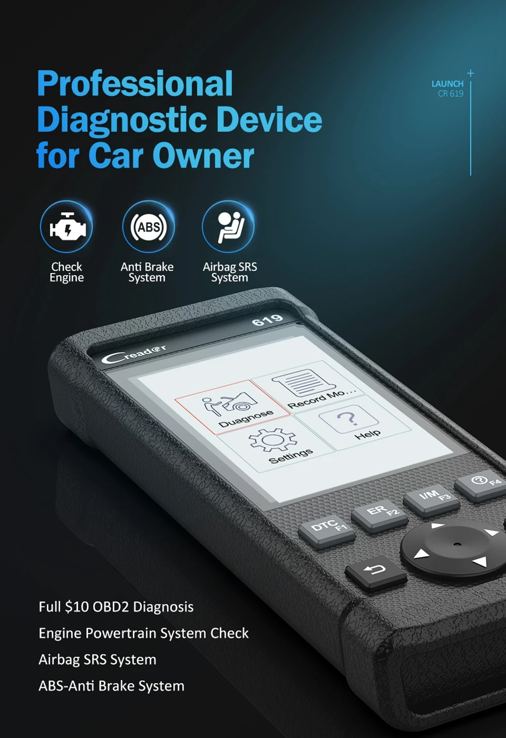 Автомобильный сканер Launch CR619, OBD2 считыватель кодов, система подушек безопасности АБС, с бесплатным обновлением, диагностический сканер для авто