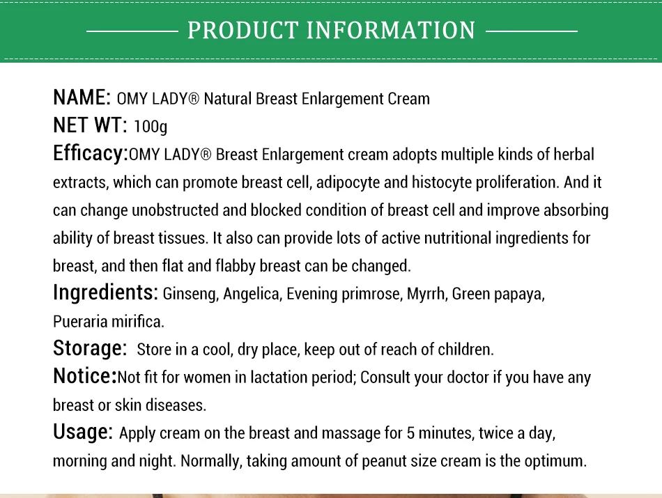 Имя: OMY LADY®Натуральный крем для увеличения груди Бренд: OMY LADY Вес нетто: 100 г Хранение: хранить в сухом прохладном месте, в недоступном для детей месте. Безопасный и эффективный Без отскока Натуральный Крем для улучшения красоты для более упругой и полной груди