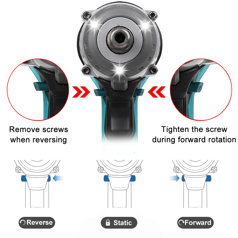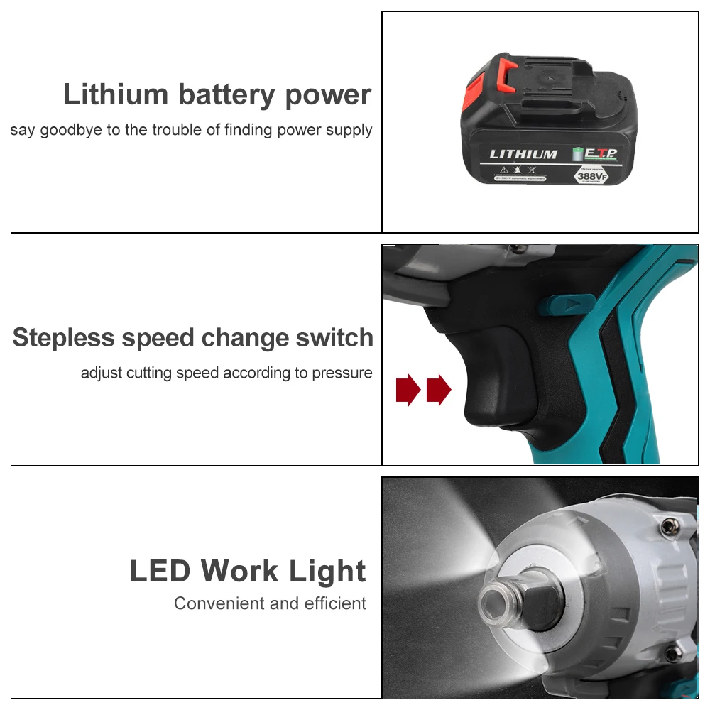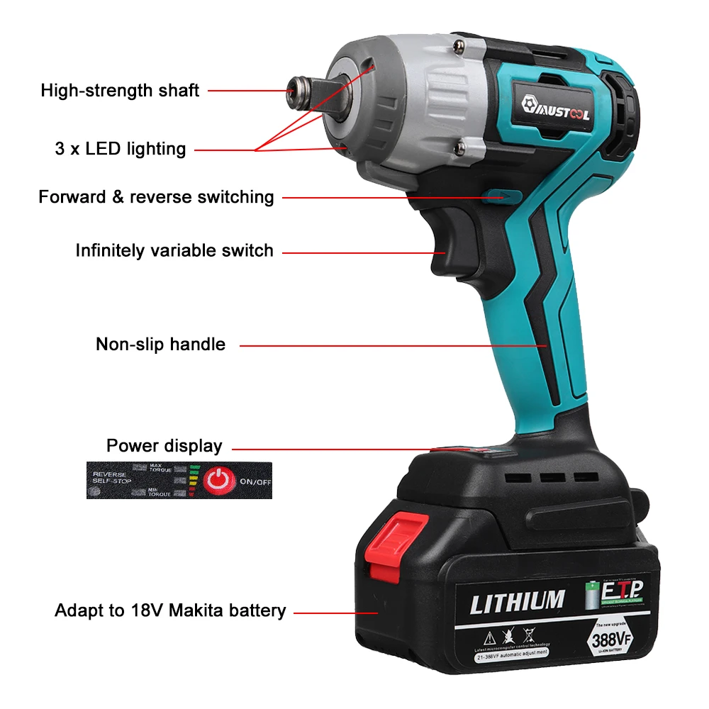 Особенности:-Высокий крутящий момент 800 нм, бесступенчатый переключатель переключения скорости.-Мощный электрический гаечный ключ, многоцелевой, супермощный.-Вал из вольфрамовой стали, высокая твердость и износостойкость.-Подходит для полок строительной площадки, обслуживания, деревообработки и т. Д.-Бесщеточный двигатель не генерирует искры при работе, а двигатель не изнашивается.-С 3-светодиодный светильник.