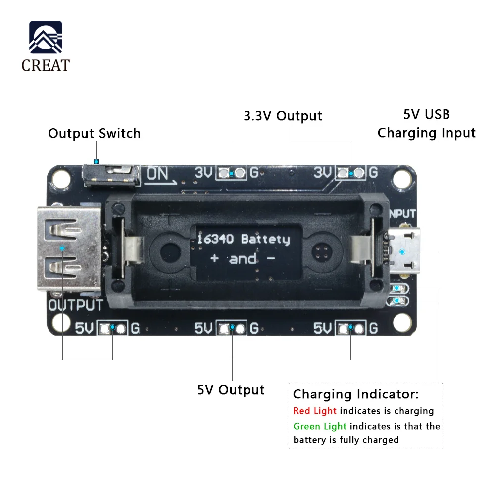 Тип 2 1. Адаптер 16340 литиевая батарея; 2. 5V и 3,3 V подключение двух устройств одновременно; 3. Встроенная литиевая батарея с защитой от перегрузки по току, перенапряжения, низкого напряжения и короткого замыкания; 4. Встроенная батарея с защитой от обратного хода; 5. Тумблер может свободно поворачивать выход. Технические параметры: Интерфейс зарядки: MicroUSB (порт Android) Напряжение зарядки: 4,5 V ~ 5,5 V Ток зарядки: 580mA max Выход интерфейс: 2,5 мм заголовка и стандартный разъем USB Выходной ток 5 В: 1,3a Макс. 3,3 В выходной ток: 1.0A max Индикатор зарядки: Красный светильник во время зарядки, полностью зеленый светильник Размер изделия: Длина 60 мм * ширина 28 мм * высота 16 мм.