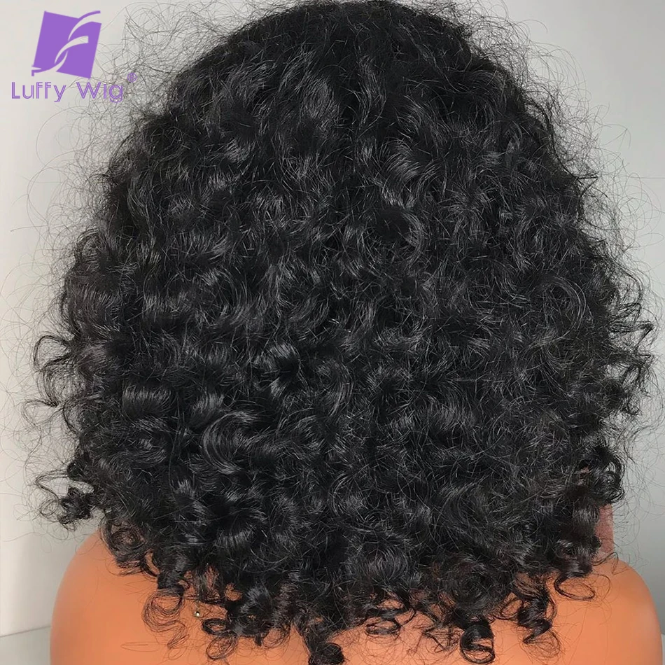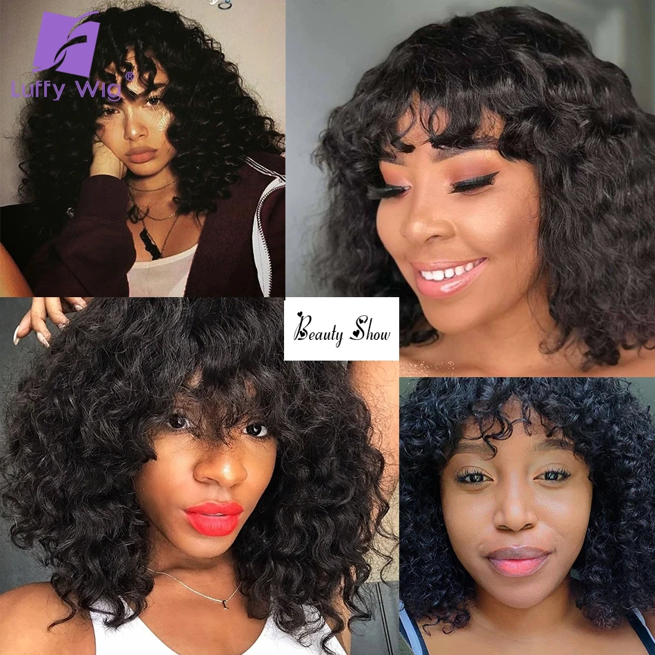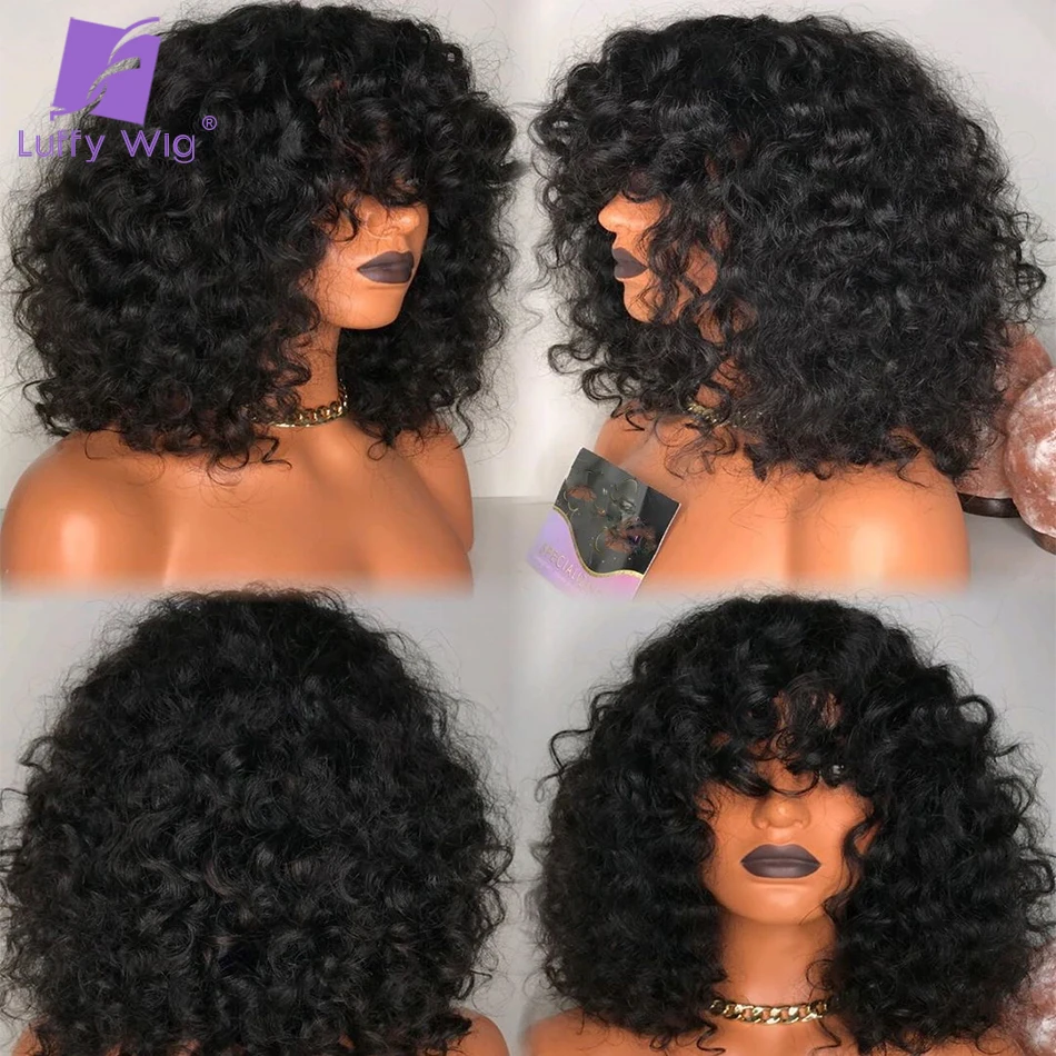 Короткие вьющиеся парики из человеческих волос с челкой, бразильские неповрежденные человеческие волосы, машинная работа, парик с косым верхом 200% для черных женщин, Luffywig