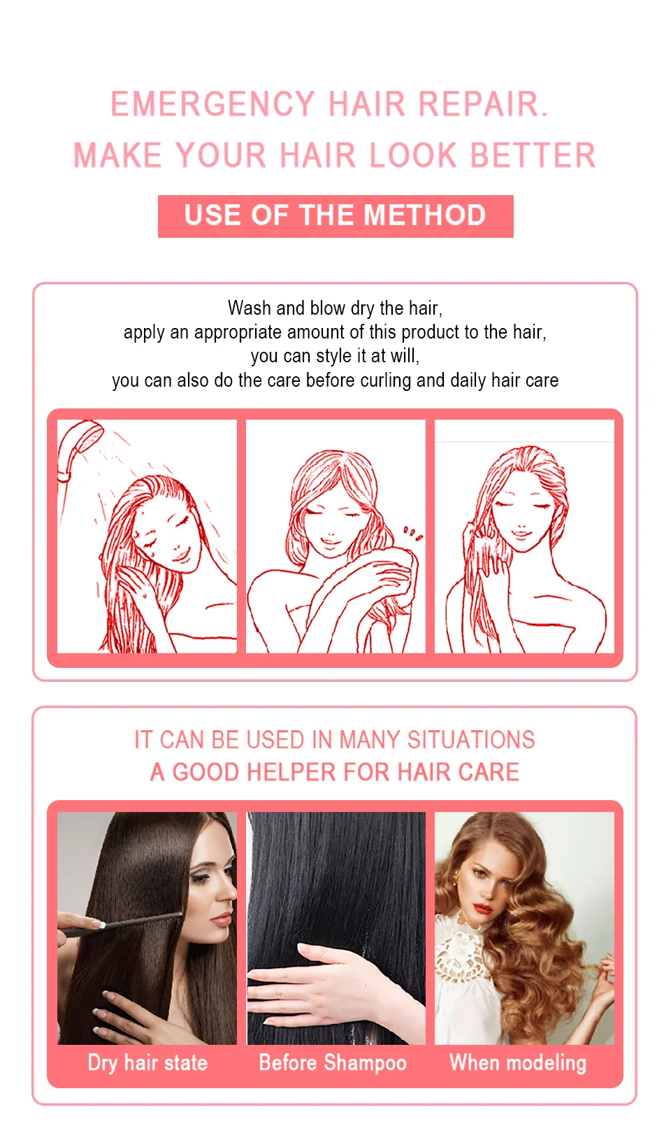 После мытья волос протрите его полотенцем, пока он не капнет, затем равномерно нанесите Кондиционер на волосы, от корней до кончиков, до тех пор, пока волосы не будут мягкими, аккуратно массируйте в течение 2-3 минут, и подождите, пока волосы полностью впитываются, нет необходимости чистить.