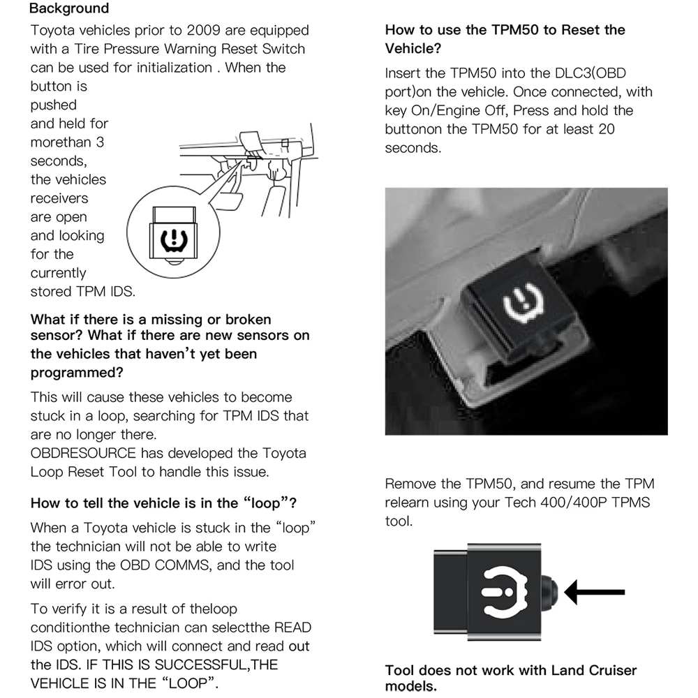 OBDResource TPM50 TPMS Loop Reset, работает с большинством моделей toyota до 2009 года, не работает с camry, Land Cruiser.