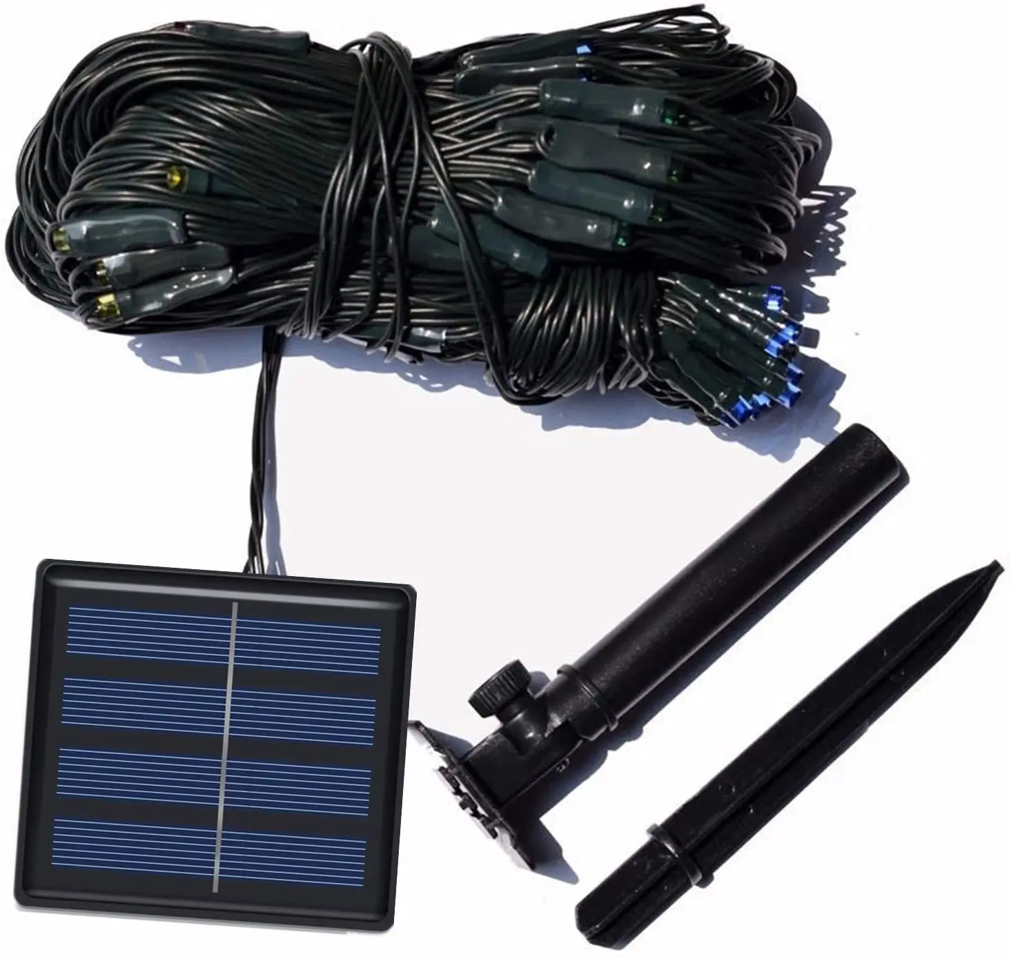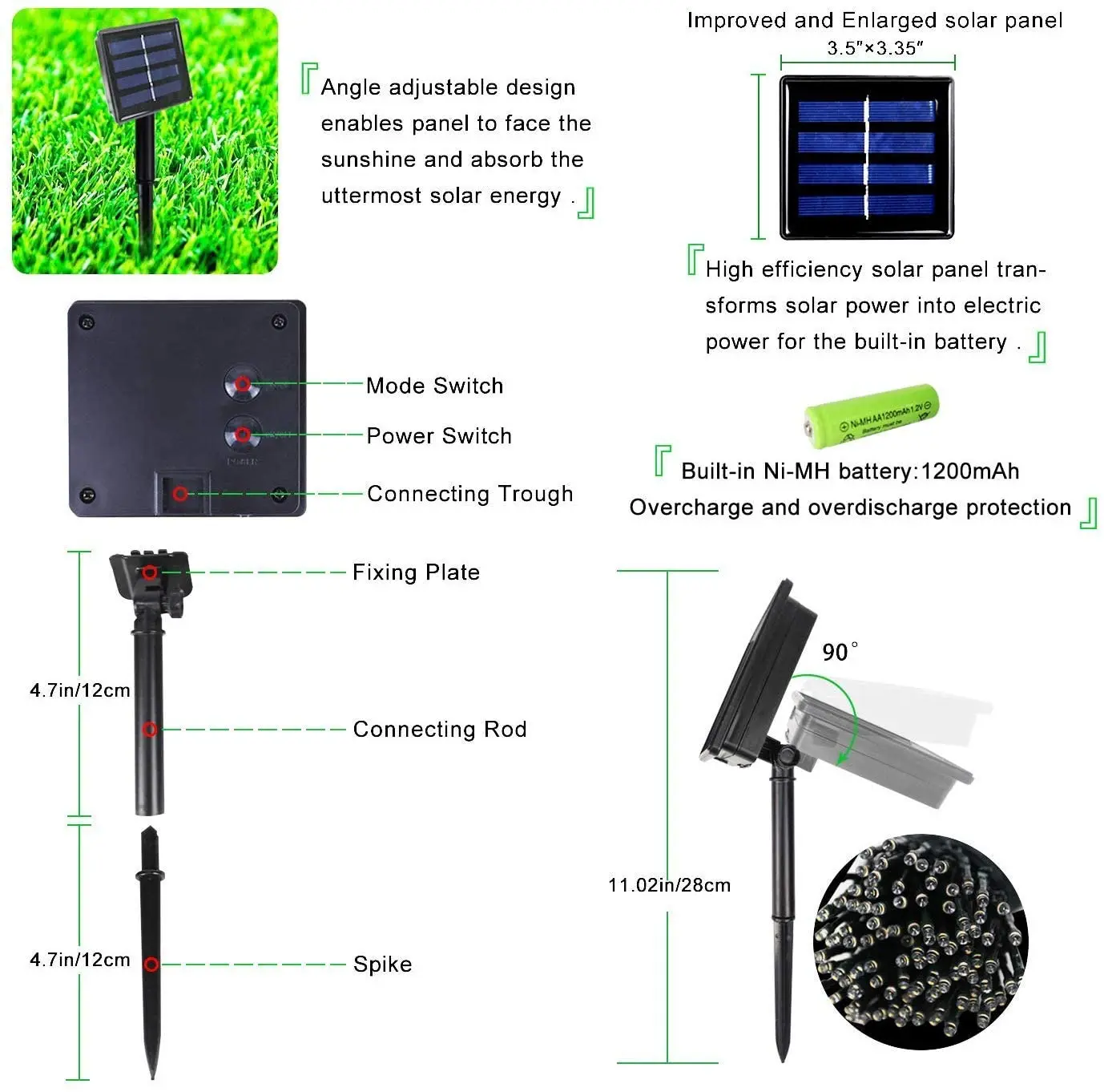 Советы1. Убедитесь, что переключатель под солнечной панелью находится в положении «ON», потому что панель заряжается только в режиме «ON».2. Перед первым использованием Установите регулируемую под углом солнечную панель, где достаточно солнечного света для зарядки не менее 8 часов.3. Время работы обычно зависит от погодных условий и времени зарядки.4. Пожалуйста, не закрывайте панель солнечных батарей и держите ее в чистоте, чтобы достичь наилучшего результата зарядки.ПараметрыЦвет: вы можете выбрать белый/теплый белый/синий/РазноцветныйМатериал: пластикРазмер: 1.1x1.1M/3X2MКоличество ламп: 100/200 светодиодныйПереключатель: ВКЛ./ВЫКЛ., 8 режимовВстроенный никель-металлогидридный аккумулятор: 1 шт. AA Размер, 1200 мАчСолнечная панель: 2 в, 150 мАВремя зарядки: 6 часовВремя работы: мигающий режим 5 ~ 10 ч; Стабильный режим 8 ~ 12 чСвинцовый кабель: 1 м/3,3 футаСолнечная панель с заземлением для легкого позиционированияПосылка включает в себя1 х светодиодный солнечный сетчатый струнный светильник1 x заземляющий шип1 х Руководство