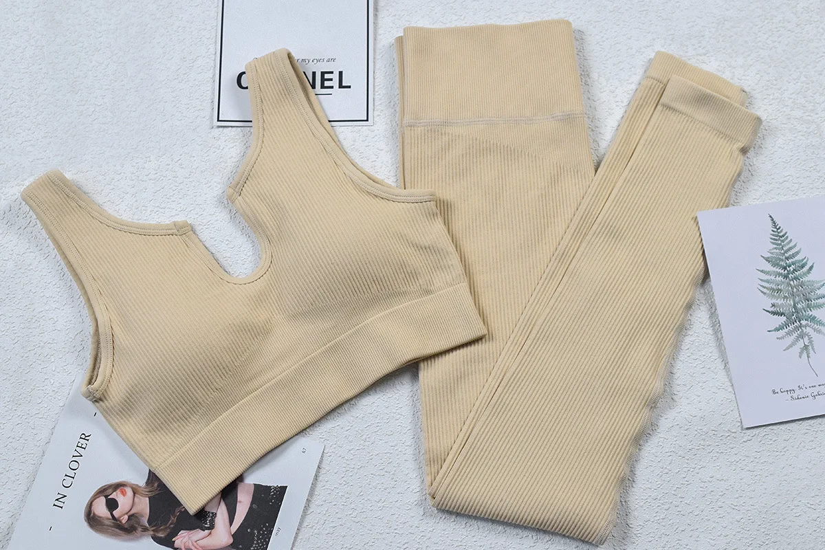 U воротник бесшовный Женский спортивный костюм коричневый два комплект из 2 предметов: топ-Бюстгальтер леггинсы для занятий йогой, спортивный костюм, наряд тренировки Фитнес Одежда для спортивного зала