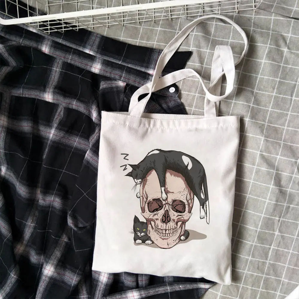 Корейская Повседневная винтажная вместительная Холщовая Сумка в стиле ольччан с изображением черепа и кота в стиле Харадзюку, Холщовая Сумка для покупок, женские сумки через плечо