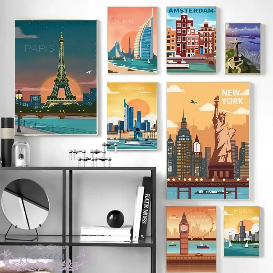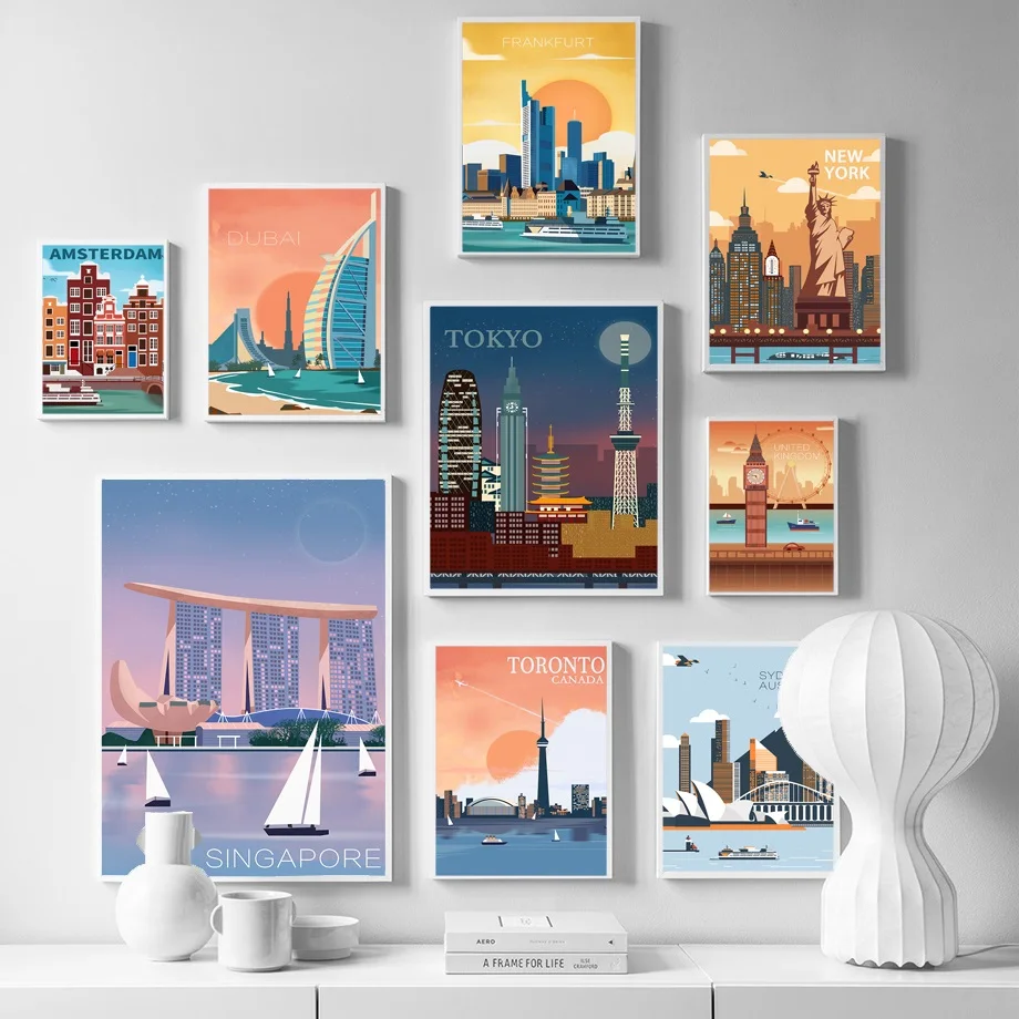 Винтажный постер в скандинавском стиле для путешествий, города, Нью-Йорк, Токио, Париж, Амстердам, Лондон, Сингапур, пейзаж, холст, живопись, настенное искусство, картины