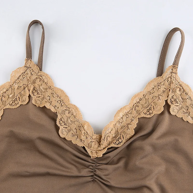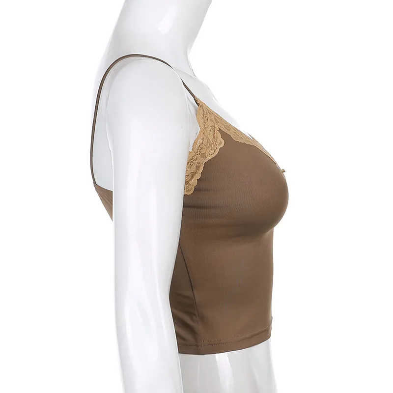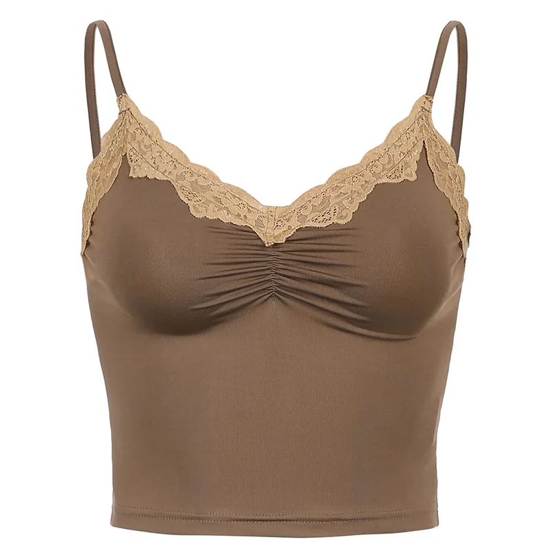 Коричневый Y2K Топы на бретельках женский с кружевной отделкой, милые, миленькие в японском стиле (Каваий) одежда v-образный вырез сексуальное винтажное 90S эстетическое школы Девочки Топ; Сезон лето