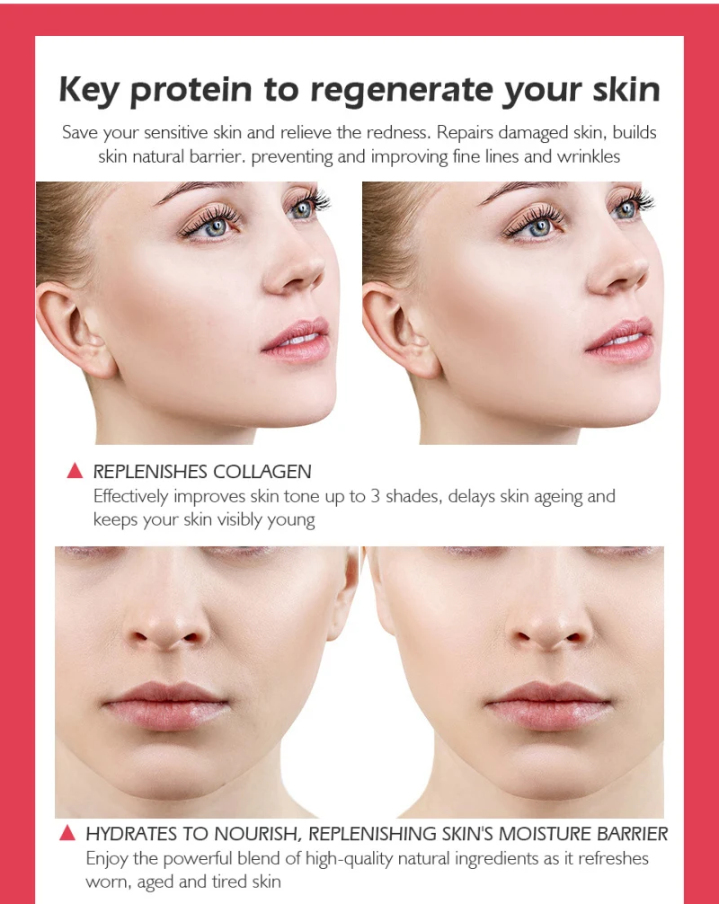 Сыворотка-белокСыворотка белка красоты крем для кожиУвлажняющий и укрепляющийАнтиоксидантная защита от старенияСпособствует регенерации клеток кожиУменьшает мелкие морщинки и морщиныОбеспечивает интенсивное увлажнение и регенерирует клетки кожи, улучшая текстуру и эластичностьОсновные компоненты: вода, каприлия/каприц триглицерид глицерин бутиленгликоль Алоэ Вера (алоэ BARBADENSIS) экстракт листьев. Этилгексил метоксицинамат цетеариловый спирт глицерилстеарат PEG-I00 стеарат этилгексил пальмитат полидиметилсилоксан сквалан PEG-20 глицерил стеарат родиола экстракт корня никоксилаксант цинокислота транзиалановая кислота ацеталановая кислота сополимер гиалуронат натрия азокситробин бисаболол динатрия EDTAЭффективность продукта: это мощная организация по ремонту. Он может производить коллаген. Генерировать гиалуронат натрия и активировать рост клеток он восстанавливает поврежденную кожу отбеливает и осветляет кожу увлажняет и окисляет кожу и задерживает старение. Он может ослабить пятна с двойными эффектами и предотвратить поколение гемосидерина и меланинаТипы кожи: подходит для различных типов кожиПосылка включает в себя:1*30 г крем