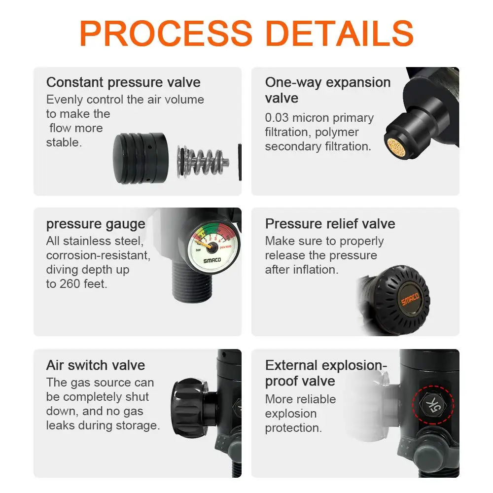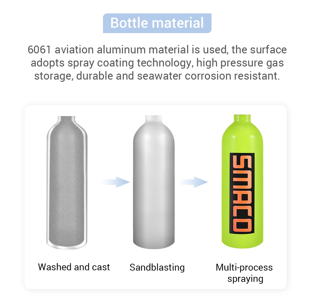 Резервуар для дайвинга изготовлен из авиационного алюминия 6061, поверхность имеет технологию распыления, хранение газа высокого давления, долговечность и устойчивость к коррозии морской воды. Интегрированный отпускной клапан имеет высокую точность и высокую стабильность, три слоя фильтрации могут эффективно защитить сердечник клапана, может эффективно организовать пыль и примеси для вдыхания. Тест-спрей для дыхательной головки в течение более 300 часов, длительный срок службы и безопасность.