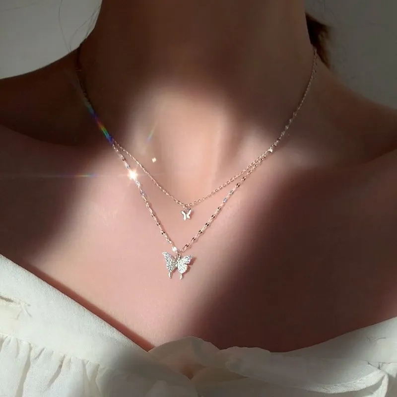Стильное Двухслойное ожерелье 2021 для женщин, чокер из Стразы серебра, простая цепочка, Ювелирное Украшение, цепь с плетением бабочка