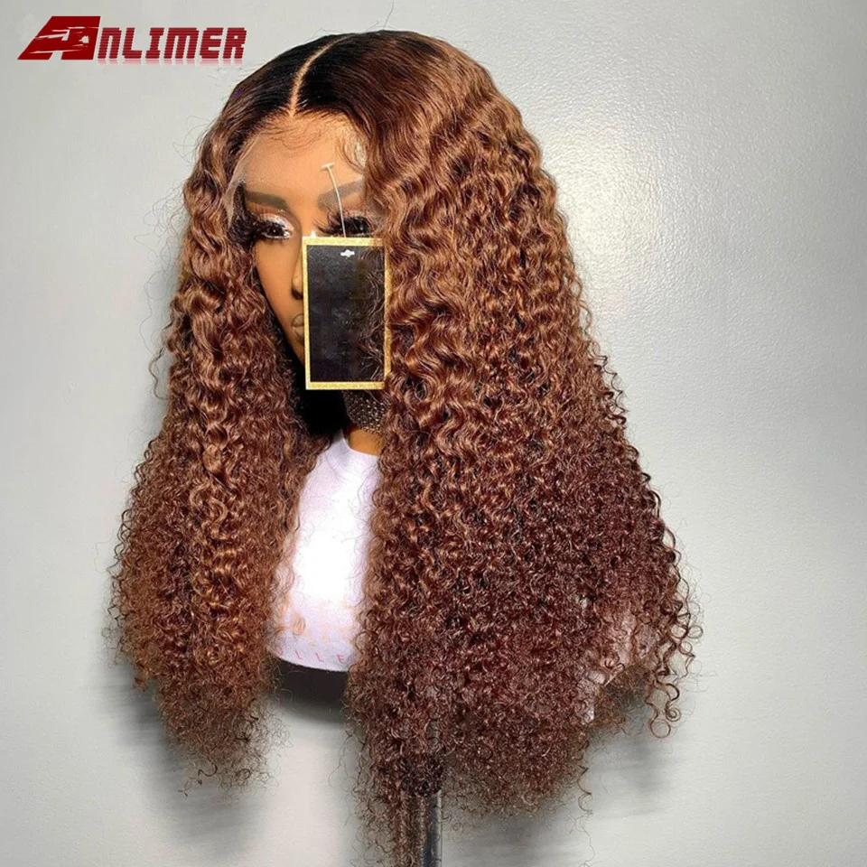 Омбре коричневый кудрявый 13x4 кружевные передние человеческие волосы парики 8-24 ''180% Плотность предварительно выщипанные бразильские 5x5'' шелковая основа Закрытие парики