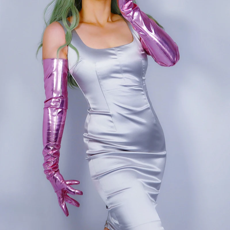 Латексные длинные женские перчатки из искусственной кожи блестящие серебристо-розовые приталенные Модные женские кожаные перчатки