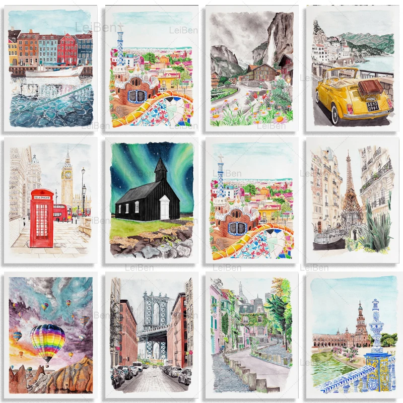 Постер с городским пейзажем ландшафт современного города, холст, роспись, Нью-Йорк, Барселона, Париж, настенный художественный постер в скандинавском стиле, домашнее украшение