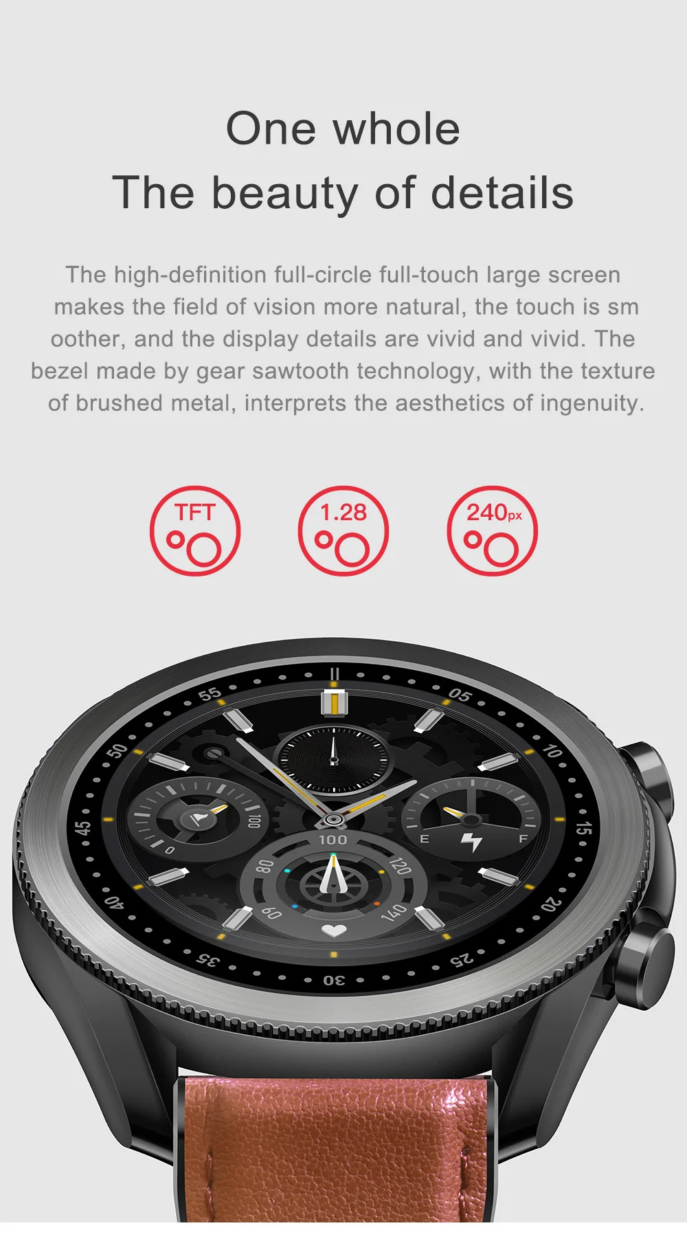 Использует большой дисплей 1,28 дюйма, более крупные слова, более четкие, высокочувствительныеT-ouchЭкран может достигать различных операций, напоминания о смарт-звонках, шагов, калорий, мониторинга сна, Bluetooth музыки, пульса, быстрого просмотра различных функций и т. Д.Et-ouchРабота большого цветного экрана более гладкая, и умная жизнь начинается с тех пор.