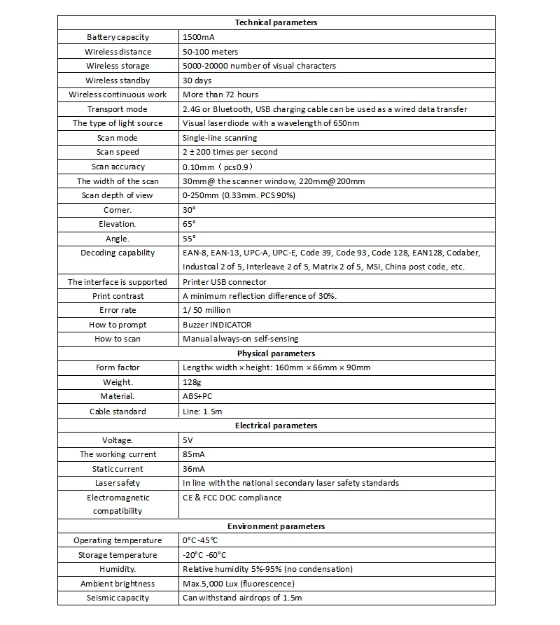 Рабочий ток: 3,3 V-5Vx150mA, idle≤ 50mAСветильник aimer:617nm светодиодныйОсвещение: 6500K светодиодныйСенсор: 640x480 CMOSИндикация: зуммер и светодиодныйРазрешение: 4 милСкорость декодирования: 500/секКонтракт на печать: > 20%Режим запуска: кнопка, непрерывная, автоматическая индукцияГлубина поля 250Lux13mil-EAN13:45-250 мм4mil-Code39:60-100 мм20mil-QR:40-250 мм10mil-PDF417:40-200 ммУгол сканирования: угол поворота 360 °, наклон ± 55 °, наклон ± 55 °Защита от помех: 0-100000Lux MaxВозможность декодирования1D:UPC-A,UPC-E,EAN-8,EAN-13, код 128, код 39, код 93, код 11,Interleaved 2of 5,industrial 2 of 5,Matrix 2 of 5,IATA 2 of 5,Coda bar,MSI Plessey и т. Д.2D: qr-код, матрица данных, PDF417, код ацтеков.Рабочая температура:-20 ℃ до 50 ℃ Температура хранения:-40 ℃ ~ + 70 ℃Относительная влажность: 5%-95% светодиодный срок службы: 100000 часовКнопка жизни: 1000000 раз испытание на падение: 1,5 мИнтерфейс: USB,USB-COM,RS232