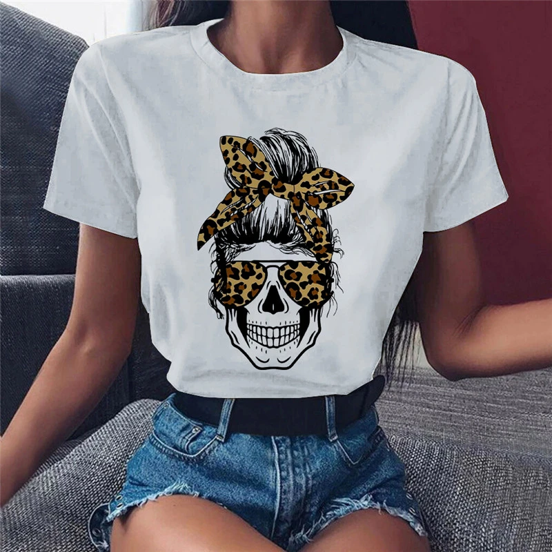 Футболка женская, с леопардовым принтом, черепом, коротким рукавом ...