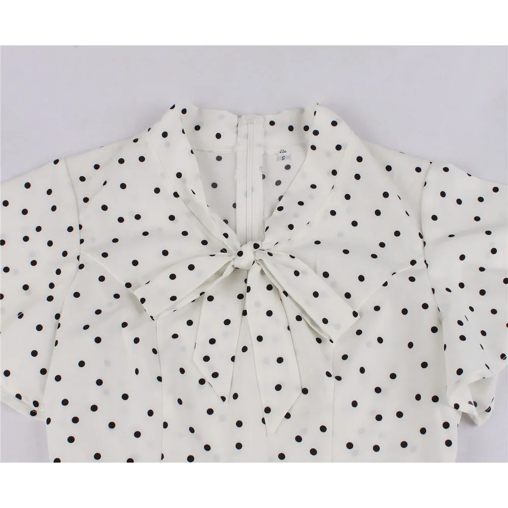 Ретро винтажная шикарная Женская Блузка офисная Повседневная белая с бантом в горошек с принтом размера плюс с короткими Рукавами Летняя женская рубашка 1950-х