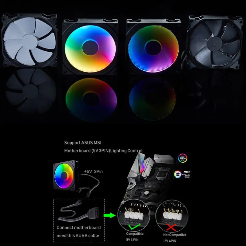 120140 мм RGB цветной светодиодный вентилятор с апертурой Halo для синхронного управления материнской платой