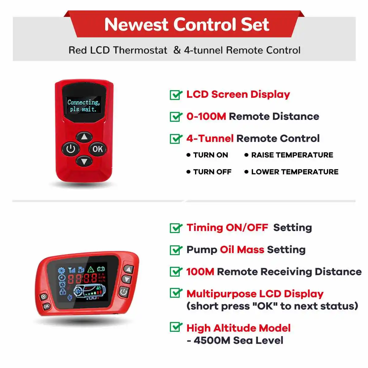 Посылка включает в себя:1 x парковочный обогреватель (ЖК-термостат)1 x красный пульт дистанционного управления (батарейки в комплект не входят)1 х воздуховодная труба1 х впускная труба1 х выхлопная трубаНабор аксессуаров для крепления-1 шт.