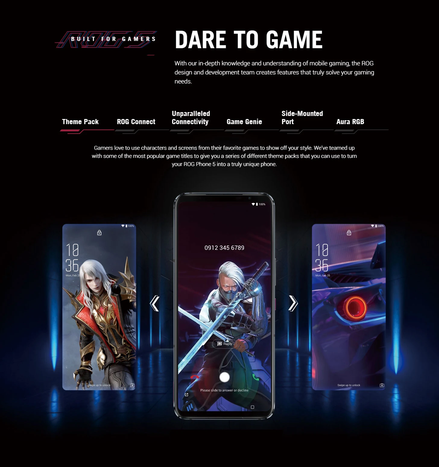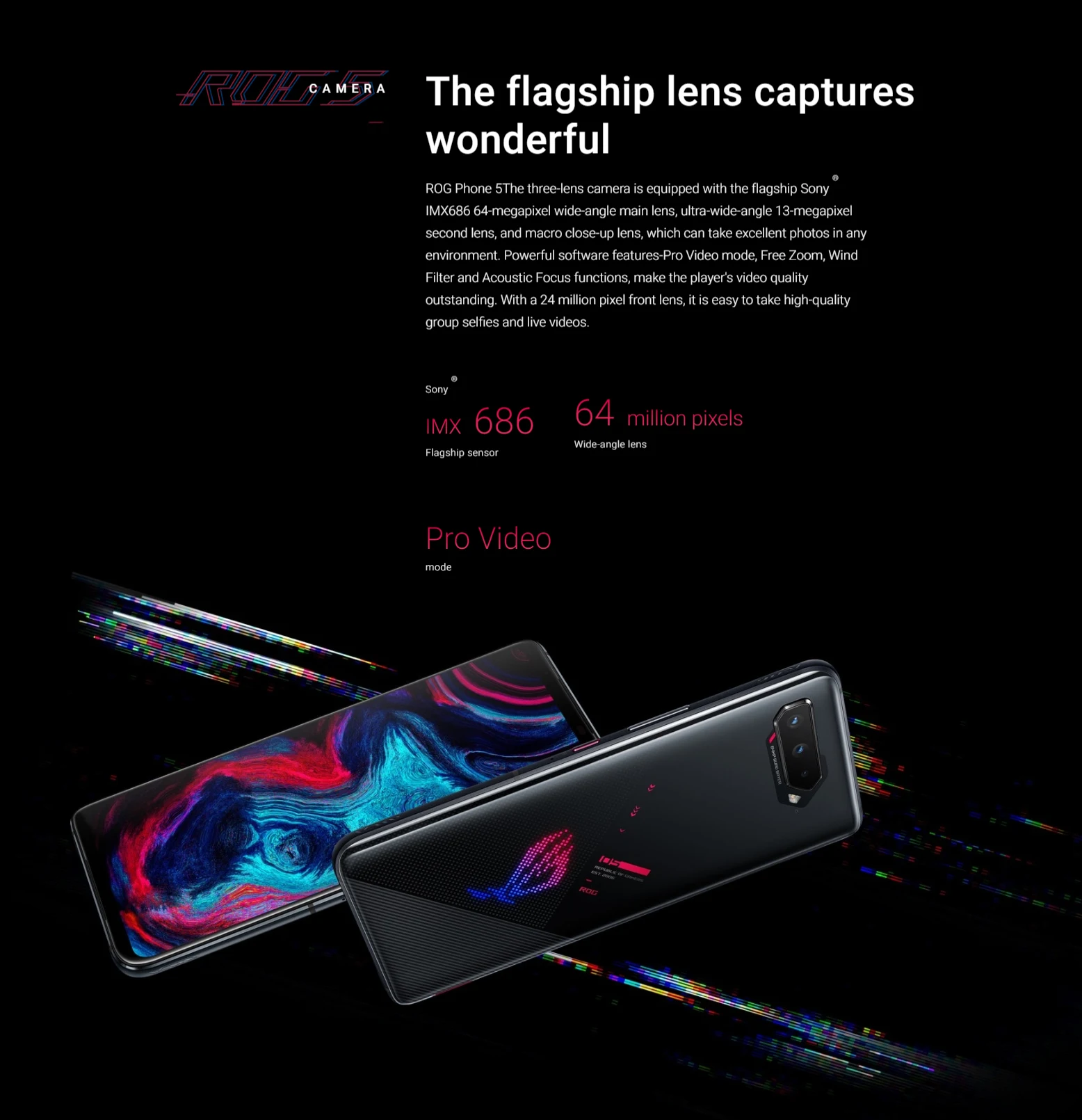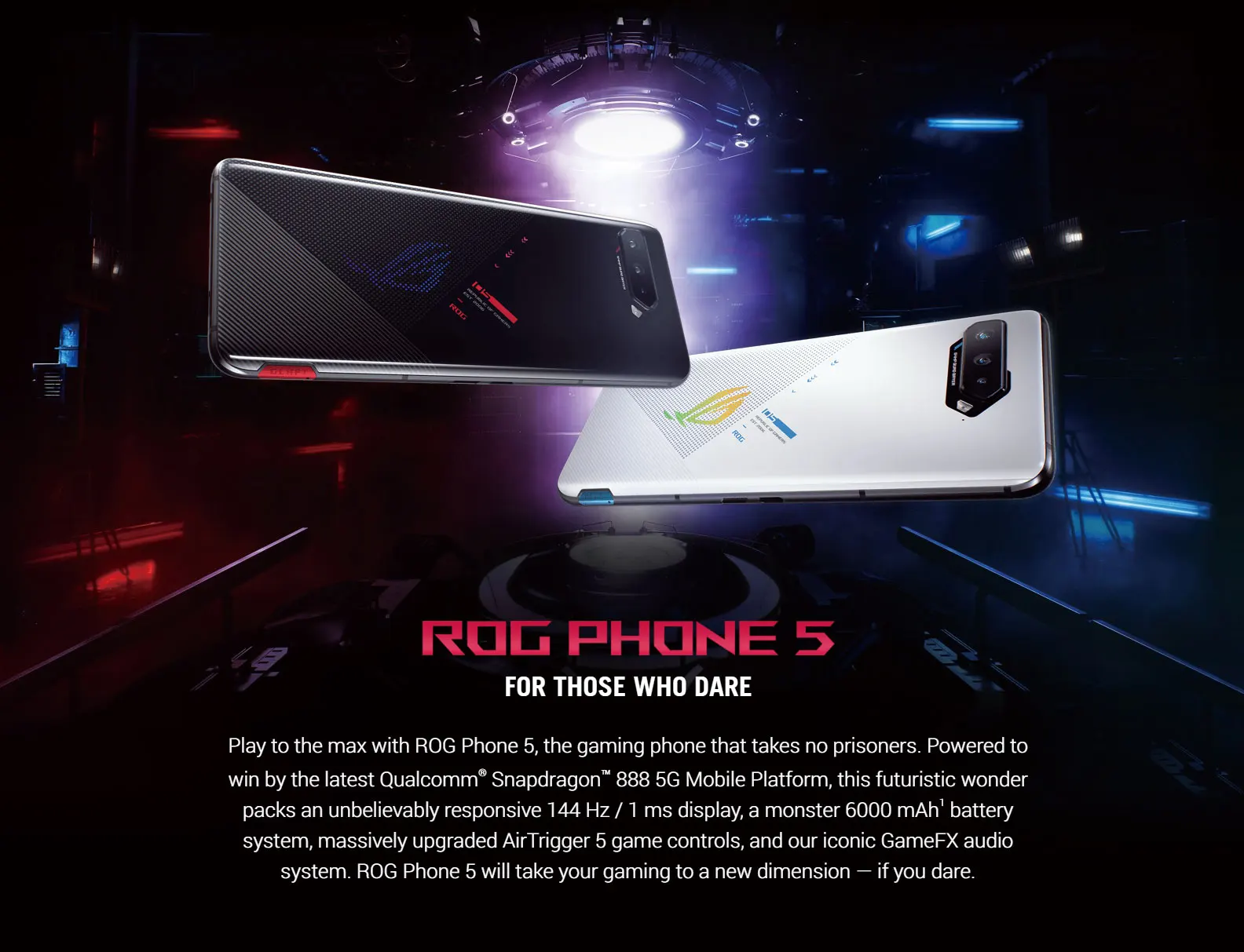 Играйте на максимум с телефоном ROG Phone 5, игровым телефоном, который не принимает заключенных. Выигрывает новейший Qualcomm®Snapdragon™Мобильная платформа 888 5G, эта футуристическая чудо-Конструкция Оснащена невероятно реагирующим дисплеем 144 Гц/1 мс, аккумуляторной системой monster 6000 mAh1, массово обновленным игровым управлением AirTrigger 5 и нашей культовой аудиосистемой GameFX. ROG Phone 5 перенесет ваши игры в новое измерение-если вы осмеливаетесь.
