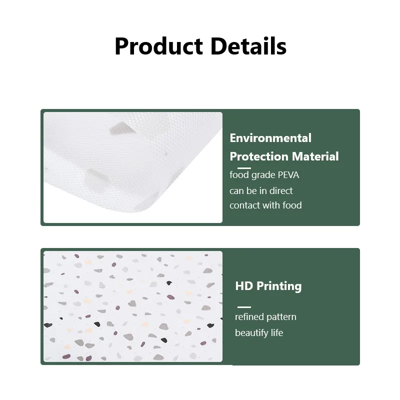Пищевой PEVA экологически чистый материал: экологически чистый, нетоксичный, биоразлагаемый, устойчивый к супер низким температурам (-70С), может быть помещен внутри холодильника, не легко издавать запах, хорошо влияет на дезодорирование холодильника и может напрямую связаться с пищей