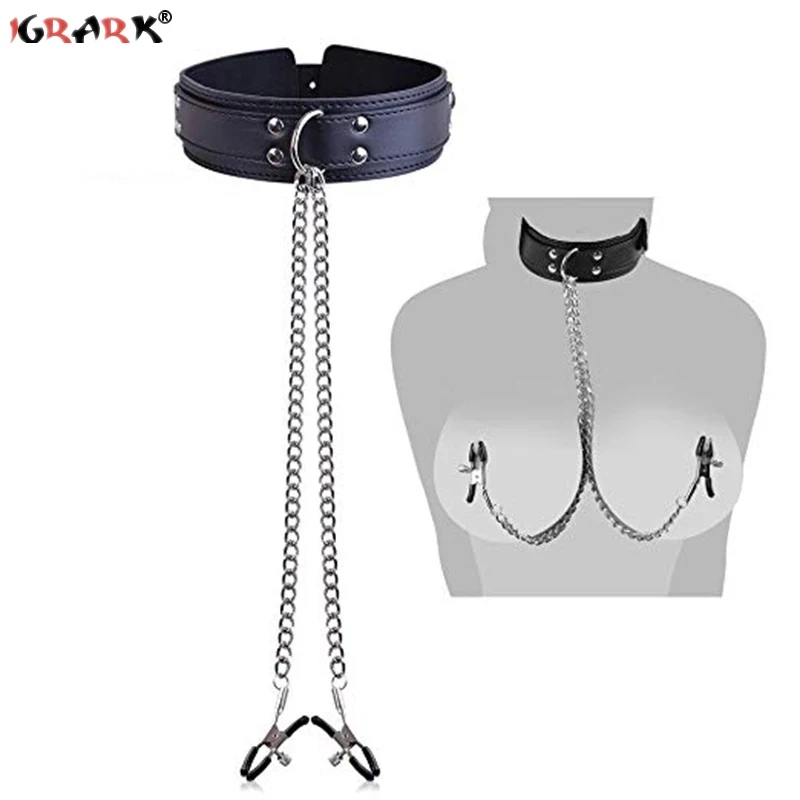 Кожаный ошейник-чокер с зажимом для груди, цепочка с зажимом для БДСМ, набор снаряжения для связывания интимные игрушки для женщин пар, инструменты для игр для взрослых