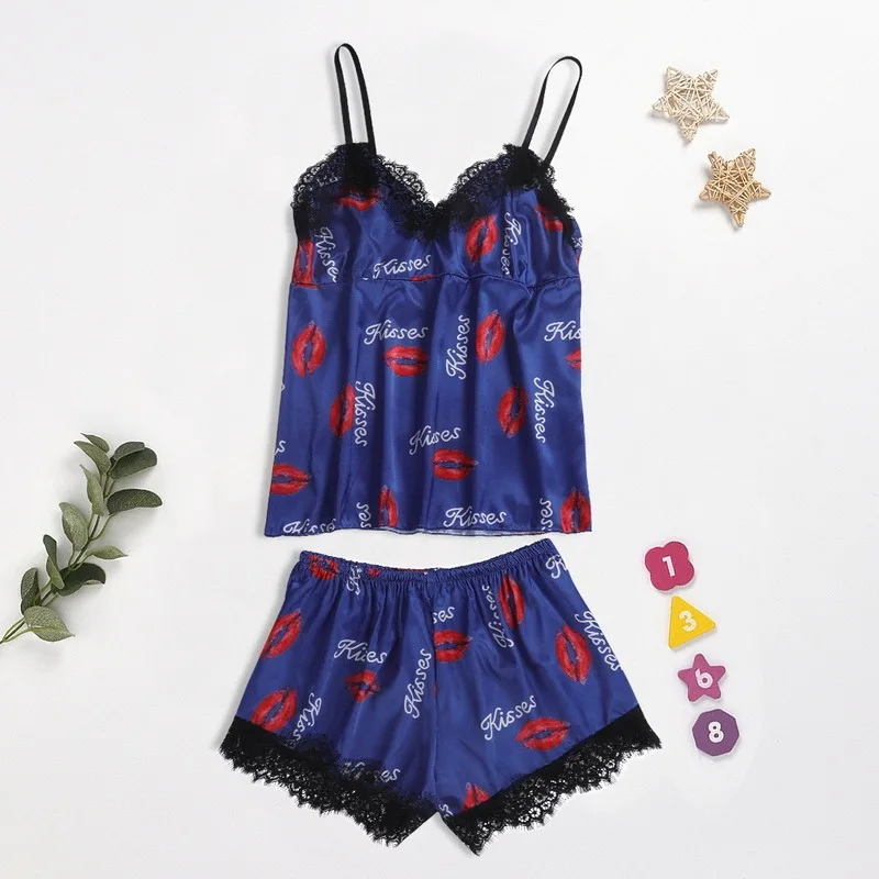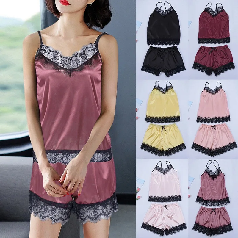Женский пижамный комплект, домашний костюм, топ и шорты, Сексуальная атласная кружевная Пижама без рукавов с V-образным вырезом, домашняя одежда для женщин 2021