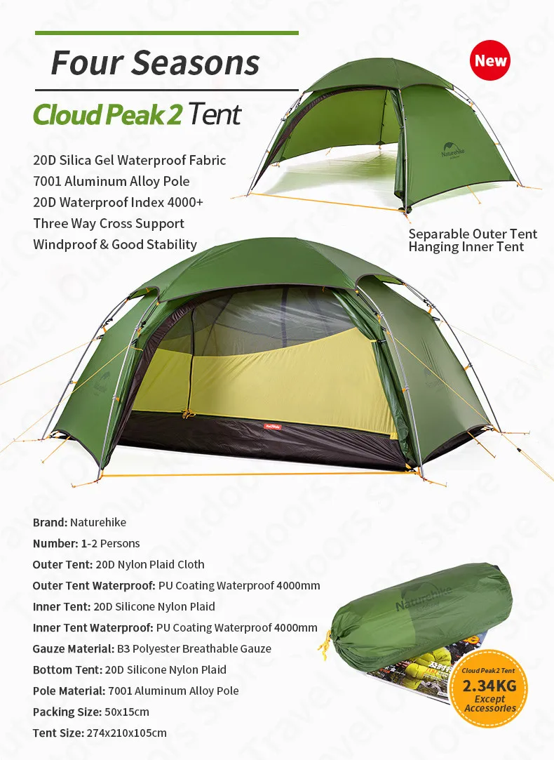 Naturehike Ультралегкая 15D20D облачная пиковая палатка для кемпинга на открытом воздухе 2 человека палатка 4 сезона 15D силиконовая туристическая палатка с бесплатным ковриком