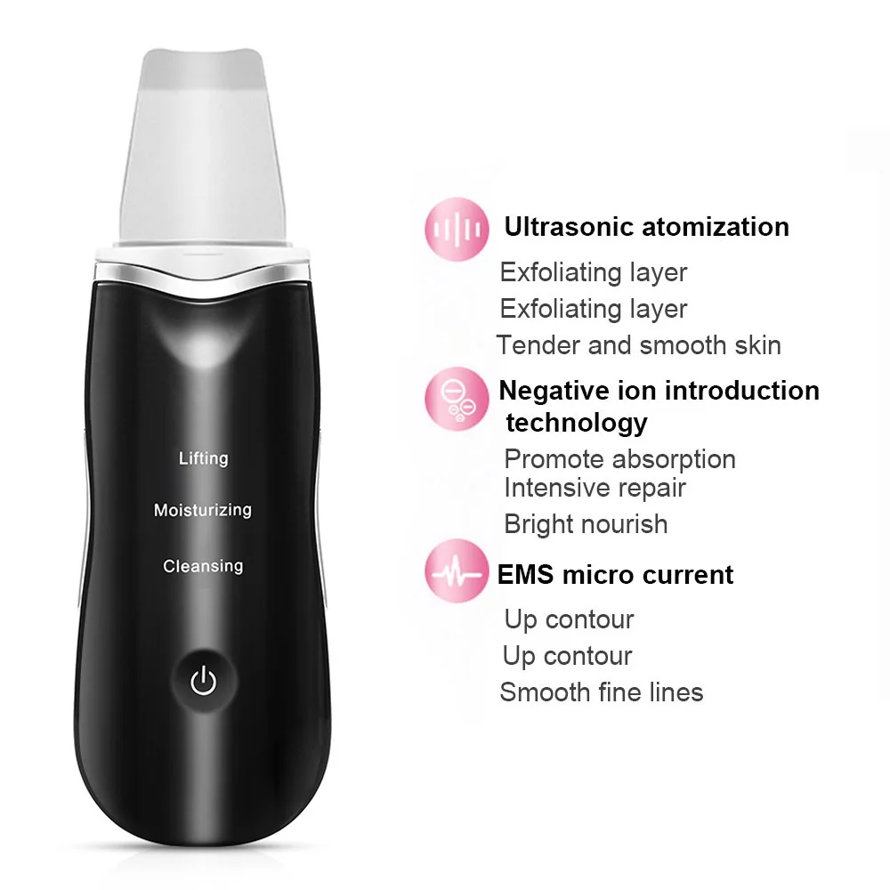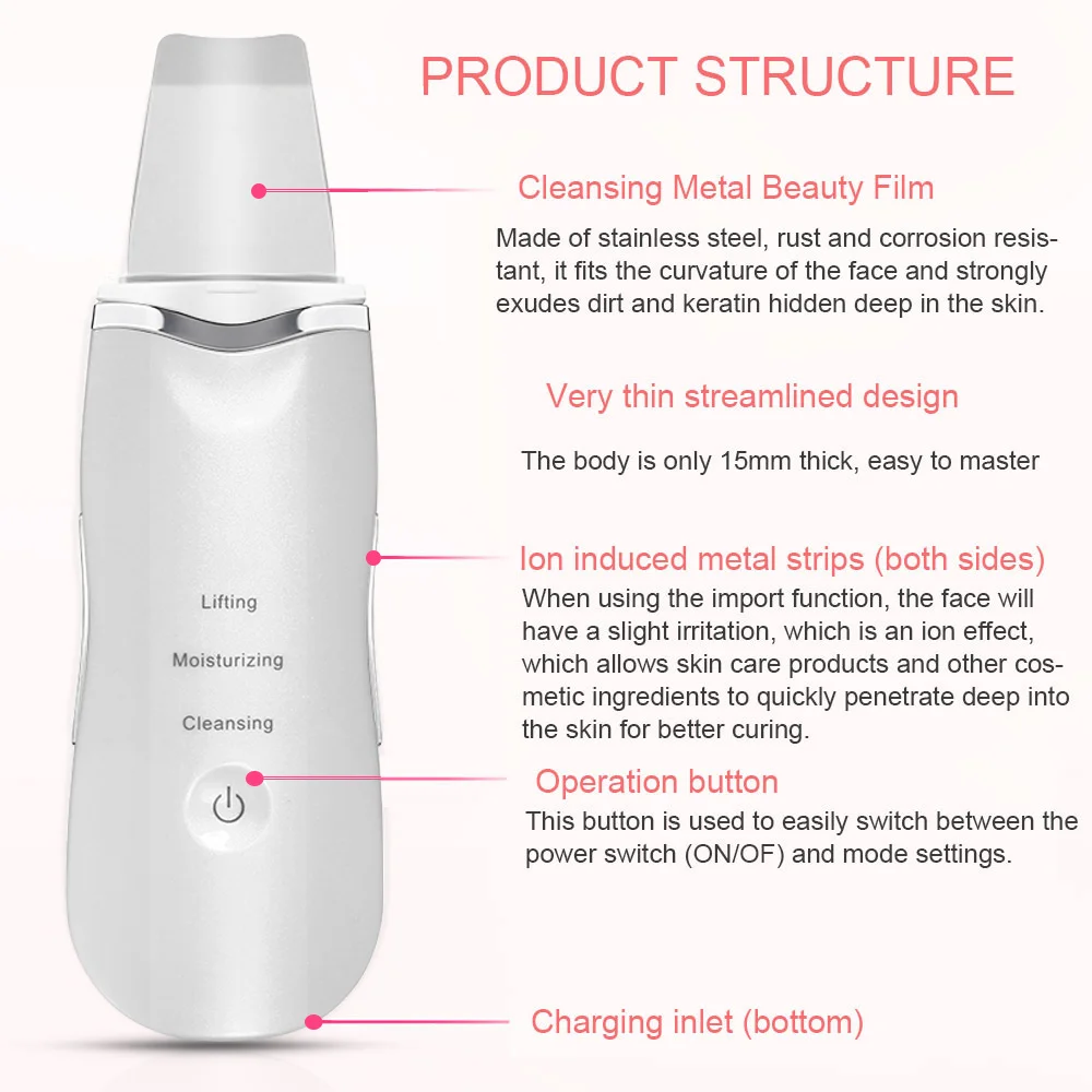 -Несколько функций: Этот скруббер работает через ультразвуковую вибрацию, которая может углубиться в поры, удалить грязь, старение клеток и корней. Он может эффективно удалять акне, угри, устранять морщины и кютис laxa, ускорять кровообращение, способствовать метаболизму, разложению меланина и рассеивать пятна.