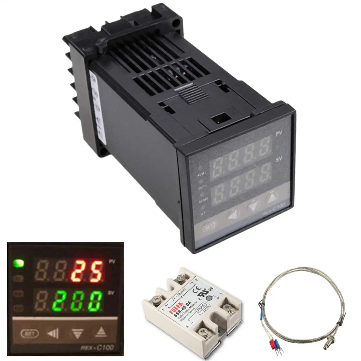 Посылка в комплекте1 x REX-C100 PID регулятор температуры1 датчик типа K1 x Макс. 40 А ССРREX-C100 110-240 в 0-1300 градусов цифровой PID контроллер температуры комплект