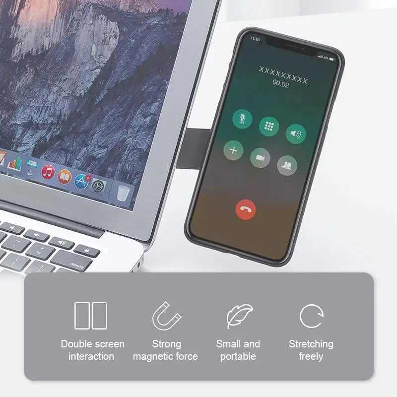 В кронштейне на мобильный телефон используется Магнитная конструкция, которая надежно адсорбирует мобильный телефон рядом с ноутбуком или дисплеем. Он очень прост в установке, переноске и использовании. Защитная губка крепится к магнитной контактной поверхности для эффективной защиты вашего оборудования.【Портативный для путешествий 】