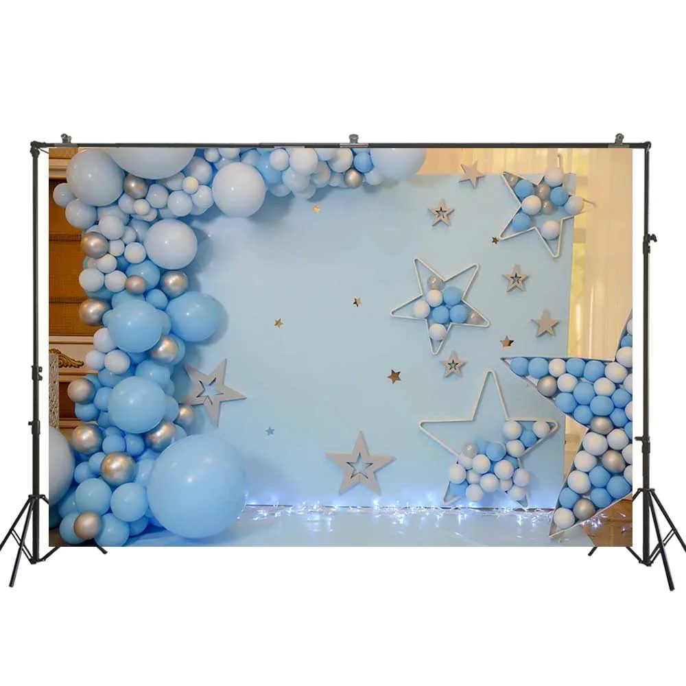 Фон для фотосъемки с изображением голубого и серебряного цветов, декоративные обои, воздушные шары, арка, звезда, портрет торта
