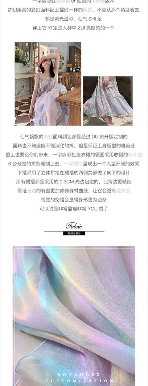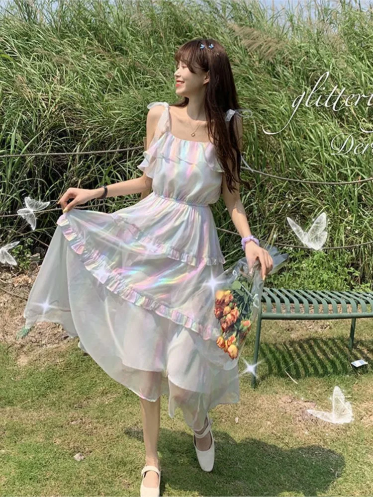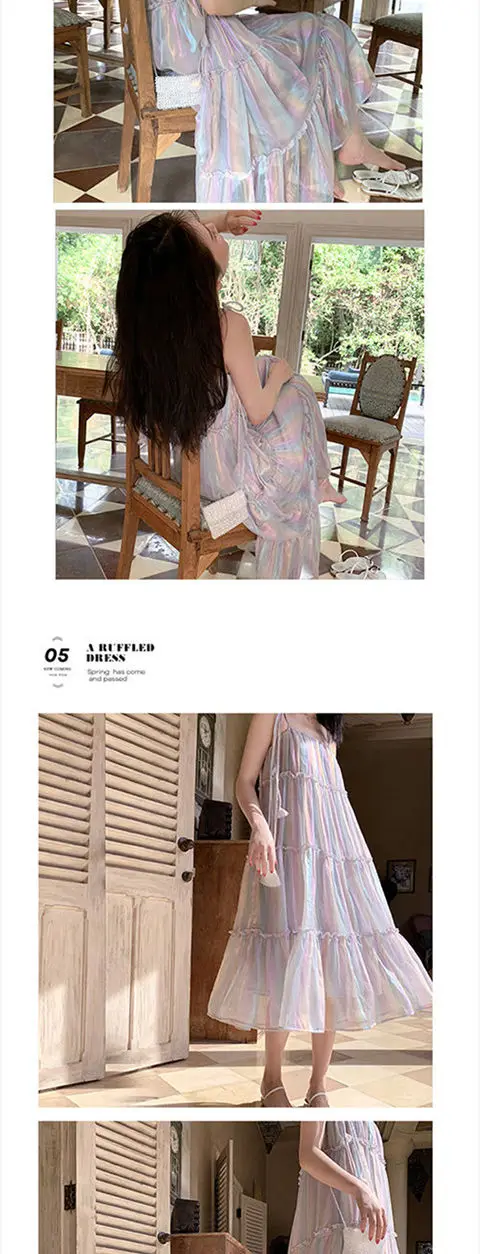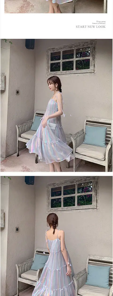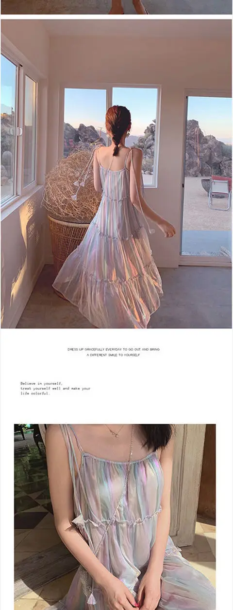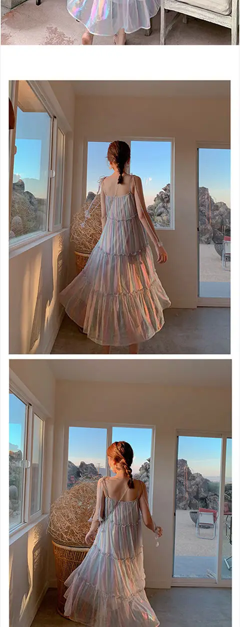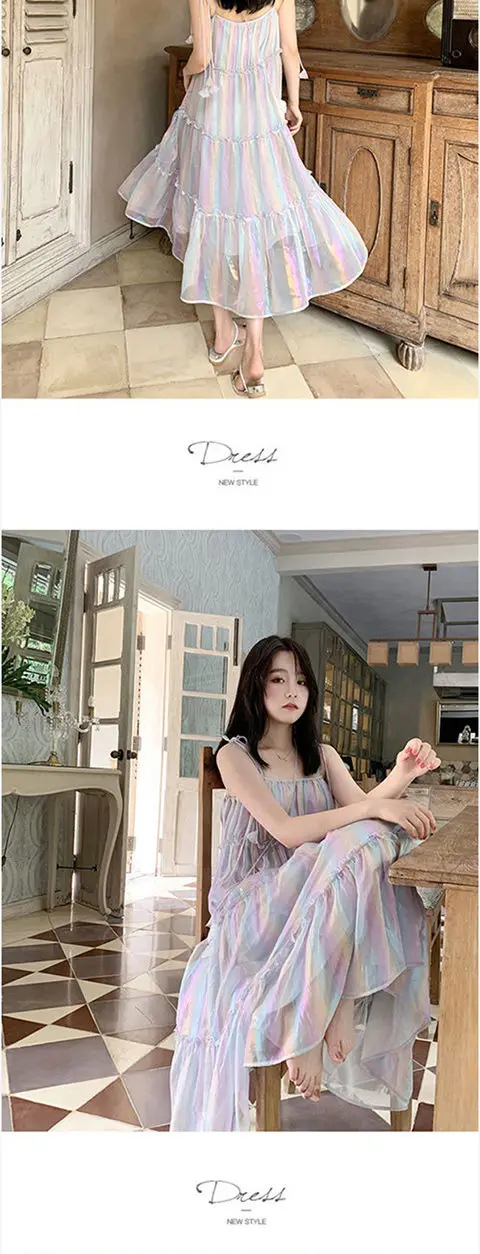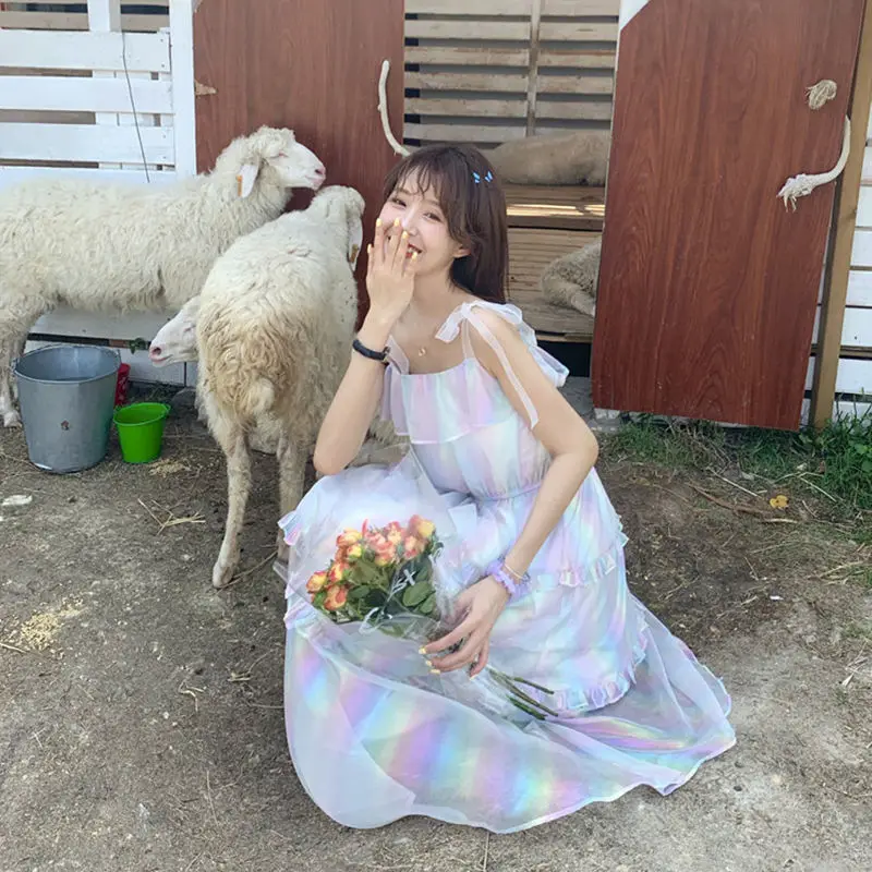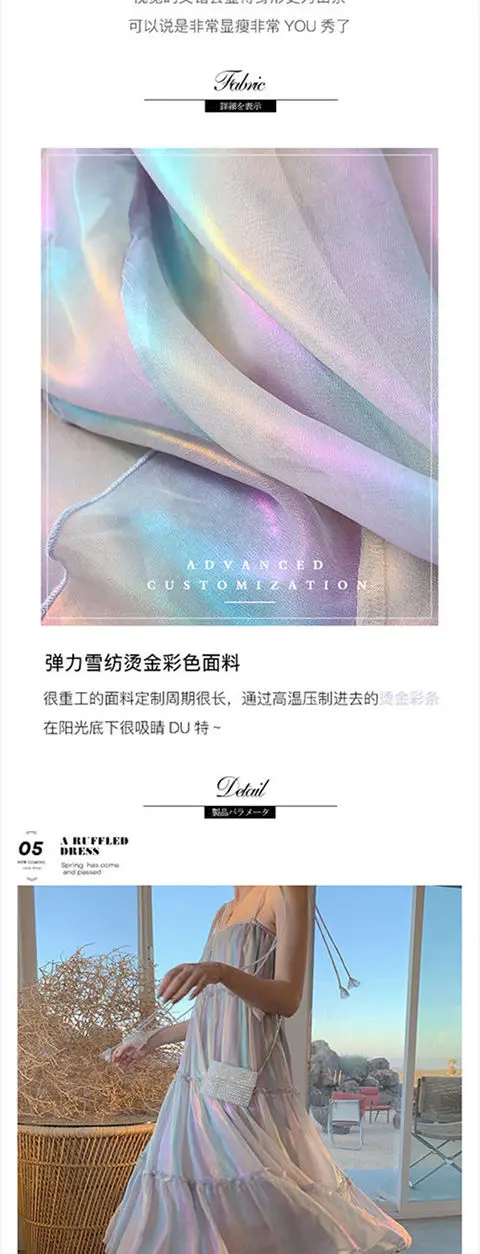 Платье женское Радужное на бретелях-спагетти, шикарный пляжный вечерний сарафан, красочная милая одежда с оборками в Корейском стиле