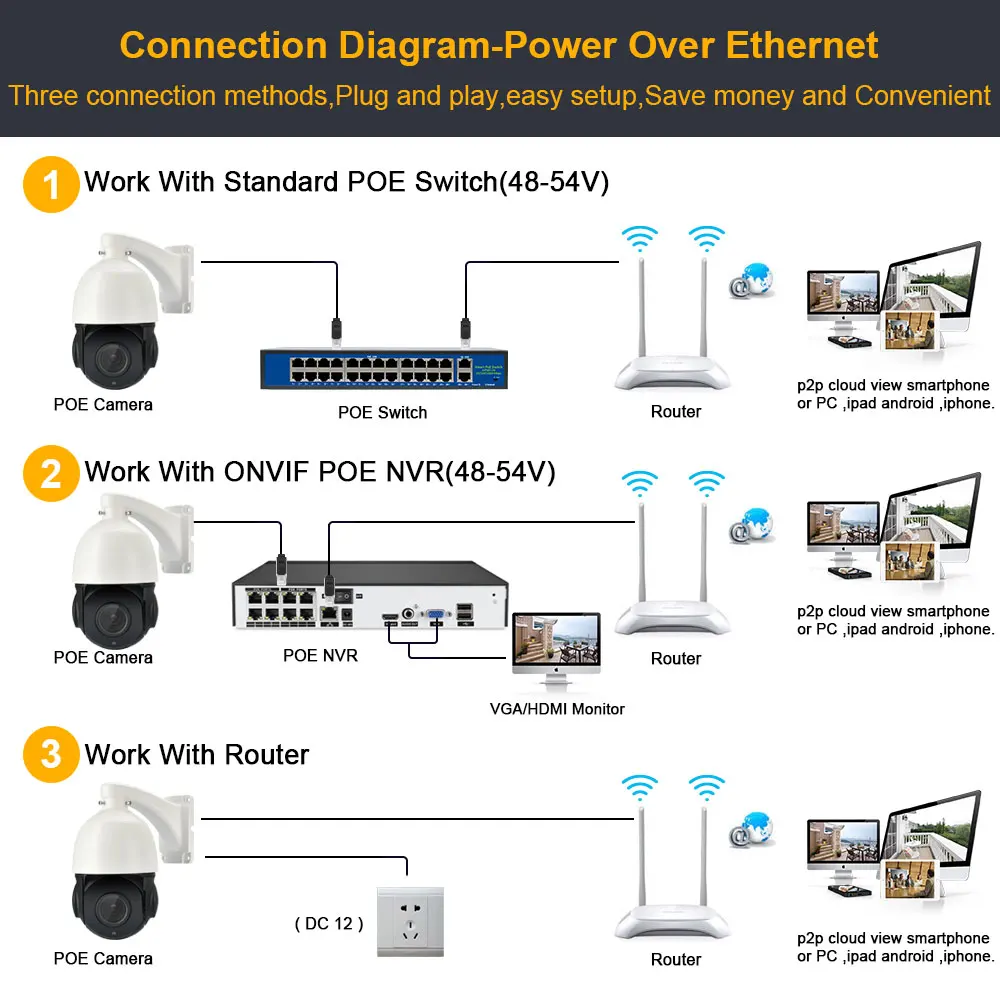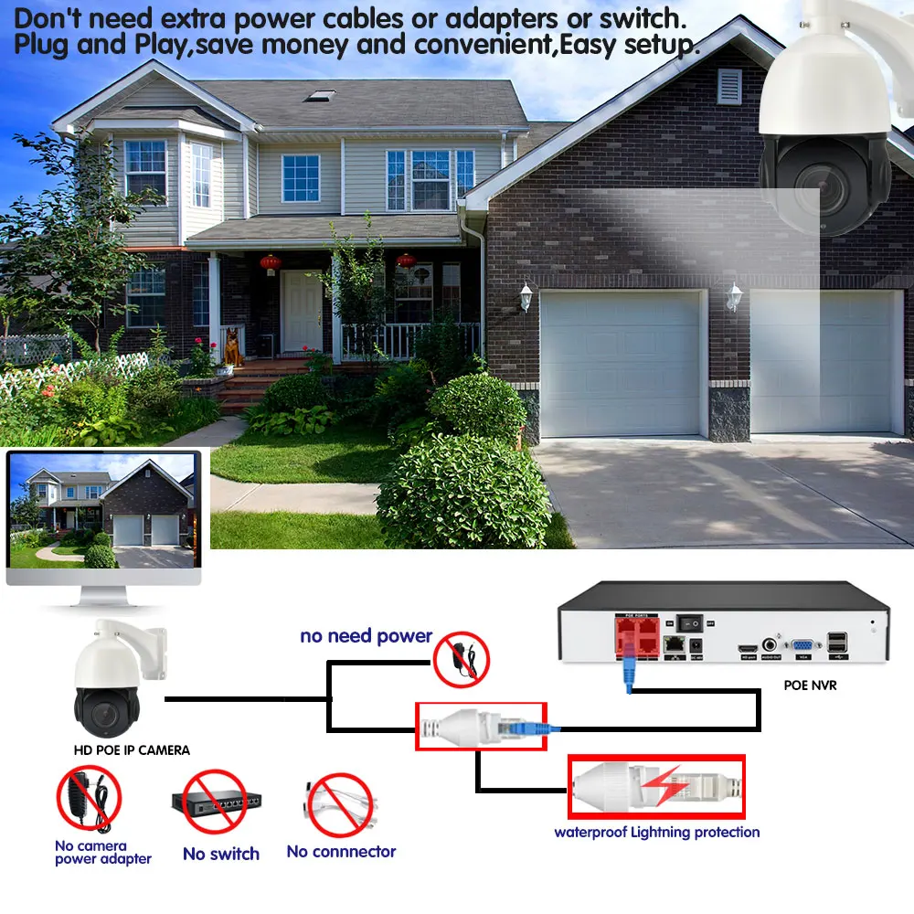 Нет дополнительных кабелей питания или адаптеров, просто подключив ip-камеру к NVR с помощью одного кабеля, вы можете легко завершить установку без знания о компьютере или сети и начать наслаждаться супер простым мониторингом среди вашего смартфона, планшета или ПК.